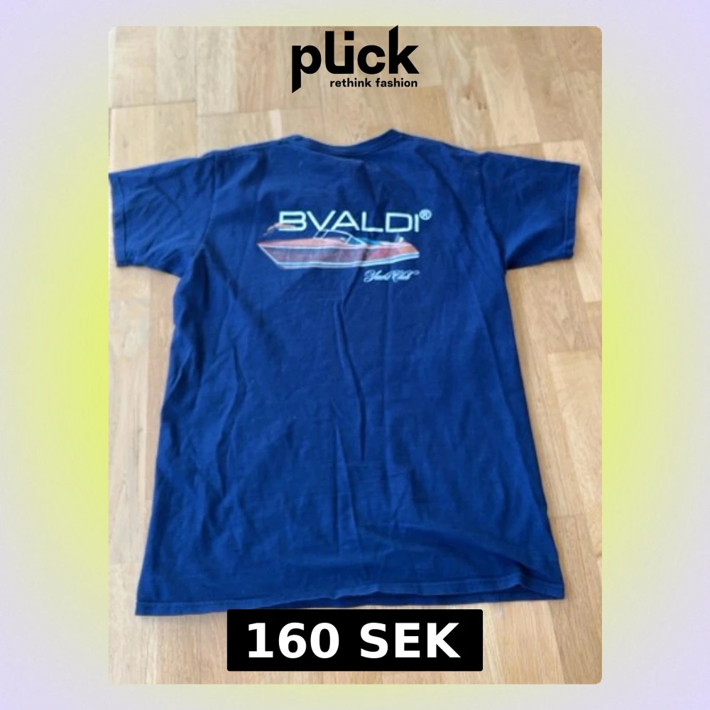 Säljer en marinblå t-shirt från BVALDI med coolt båttryck och logga på ryggen samt mindre logga framtill. Klassisk rund hals och korta ärmar. Perfekt för dig som gillar stilrena och marina vibbar.