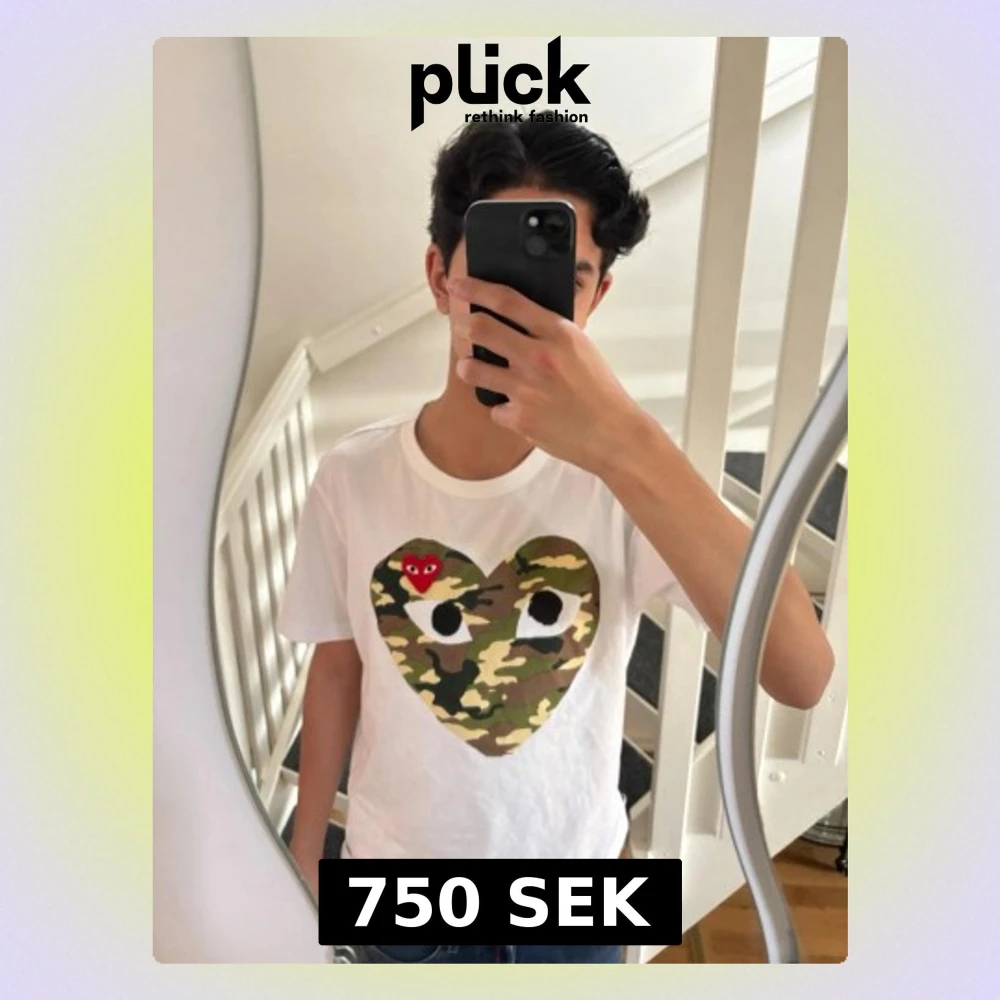 Säljer en vit t-shirt från Comme des Garçons Play med det ikoniska hjärtmotivet i camouflage och ett litet rött hjärta på bröstet. T-shirten har rund hals och korta ärmar. Perfekt för dig som gillar streetwear och vill sticka ut.