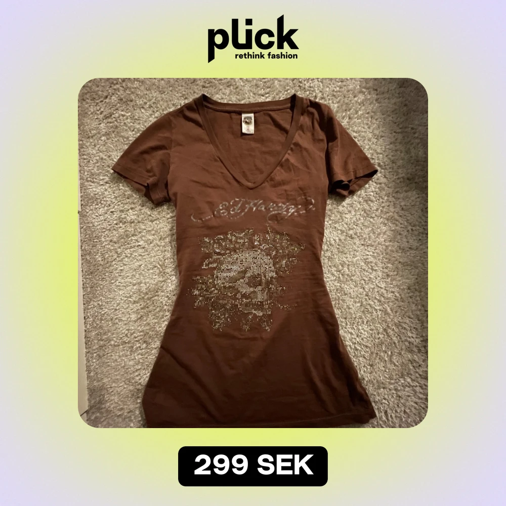Säljer en brun t-shirt från Ed Hardy med glittrande paljettdetaljer och ett coolt tryck på framsidan. T-shirten har en v-ringad hals och korta ärmar, den är insydd i midjan för att passa mig så den sitter mer som en S men går lätt att sprätta upp och kan fixa innan ja skickar den😊Han själv inte använt den så mycket men tror den har nåt litet hål nån stans och sen tappade stenar som man kan se på bilden