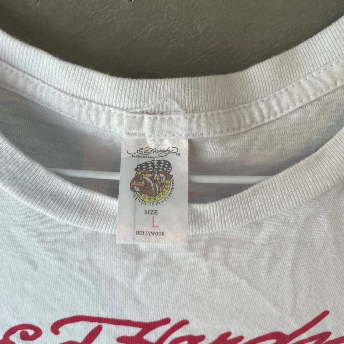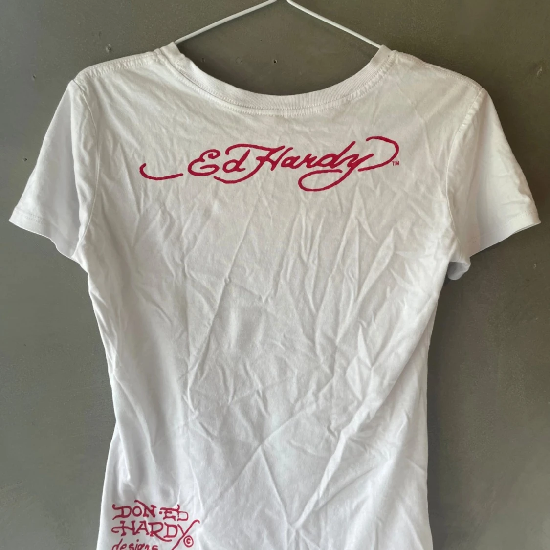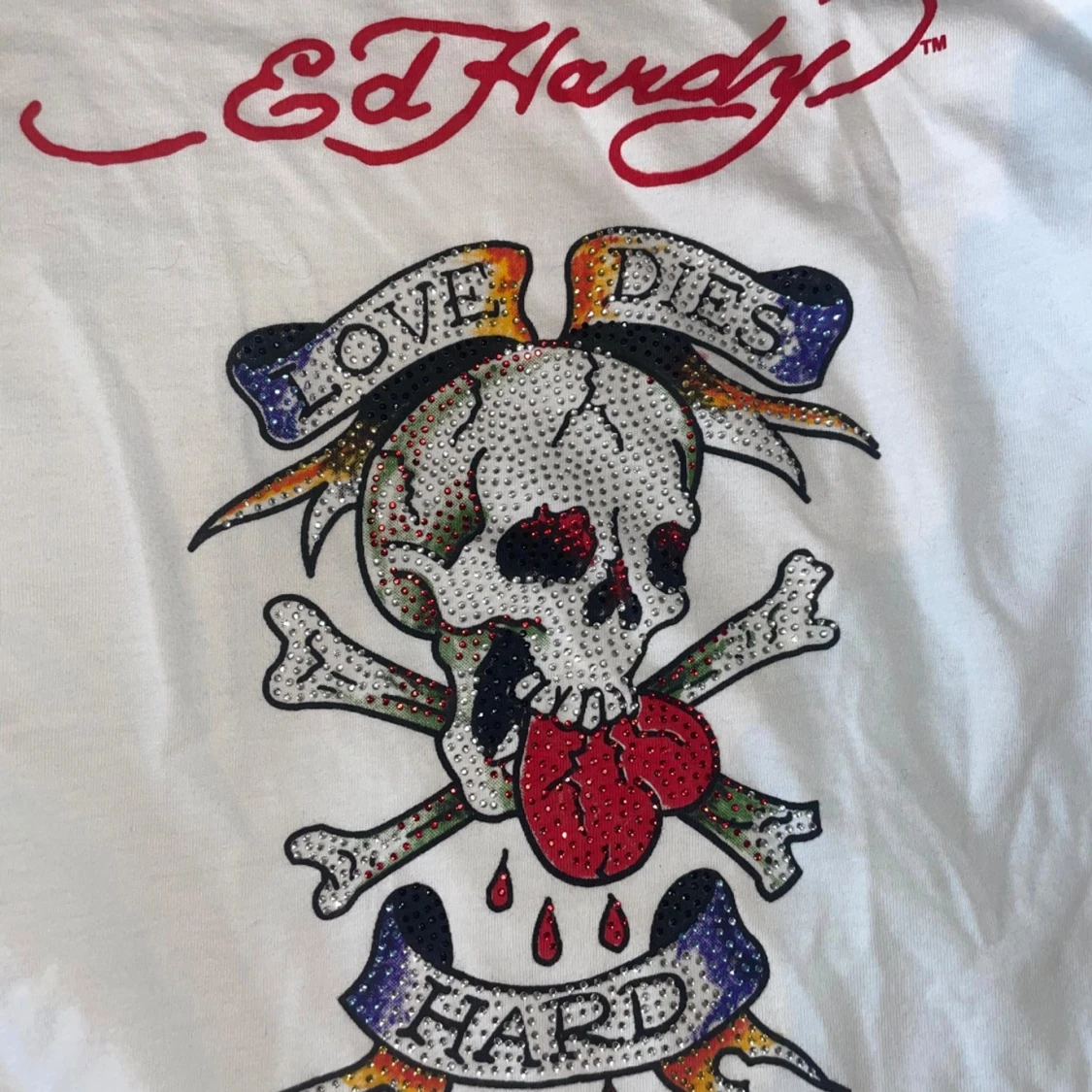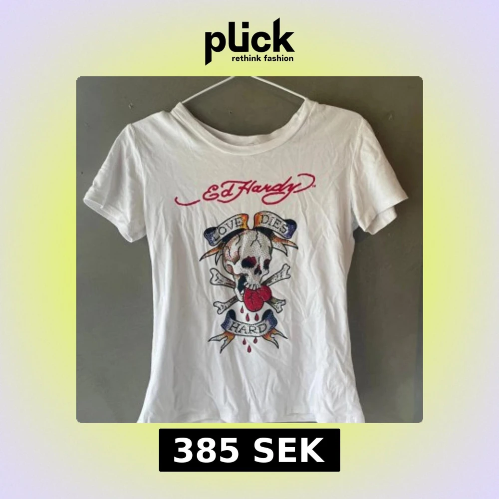 Jätte snygg ed Hardy T-shirt som jag inte använder. Alla diamanter sitter kvar och den ser nästan helt ny ut. Storlek L men känns som XS-M därför säljer jag den då den börjar blir lite liten för mig.