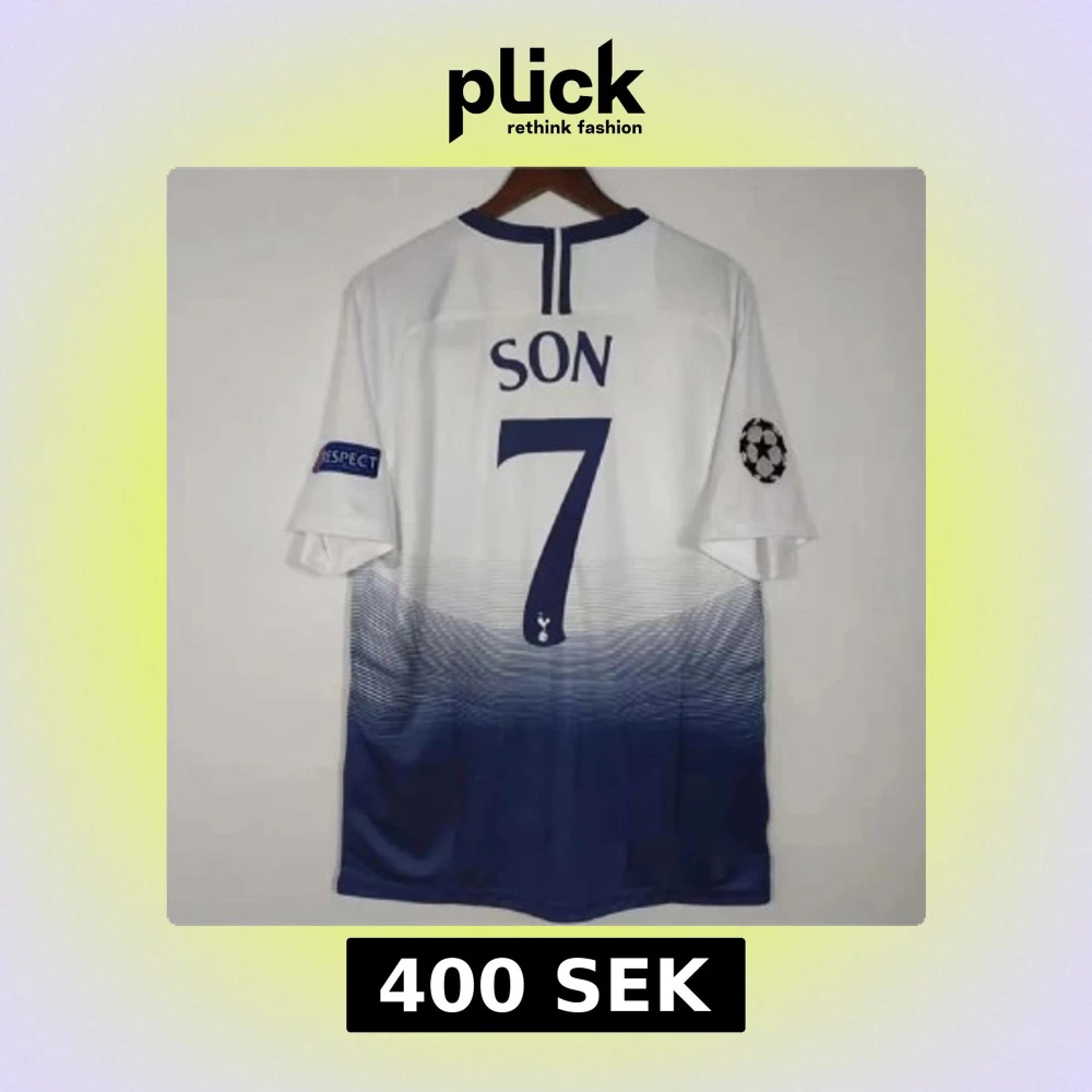 Snygg Tottenham Hotspur fotbollströja med Son 7 på ryggen. Tröjan är vit upptill och övergår i mörkblått nertill med tunna horisontella linjer. Champions League-märke på ena ärmen och Respect-märke på den andra. Perfekt för dig som älskar Spurs och Son!
