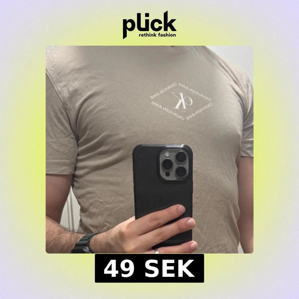 Säljer en beige t-shirt från Calvin Klein Jeans med liten vit logga tryckt på bröstet. Klassisk passform och rund halsringning. Perfekt för en stilren och enkel look.