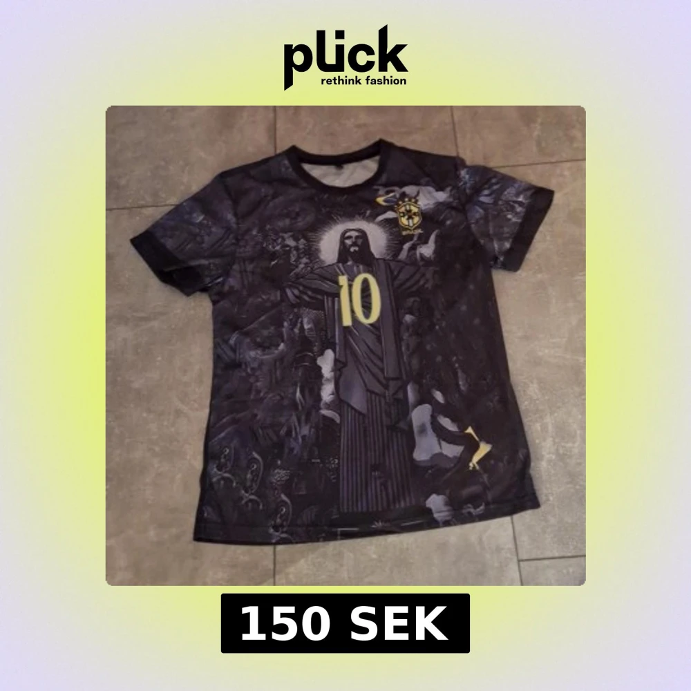 Snygg svart fotbollströja med Neymar JR och nummer 10 i gult på ryggen. Framsidan har ett detaljerat grafiskt tryck med Kristusstatyn och Brasil-logga på bröstet. Kortärmad och tillverkad i lätt, ventilerande material som passar perfekt för match eller träning.