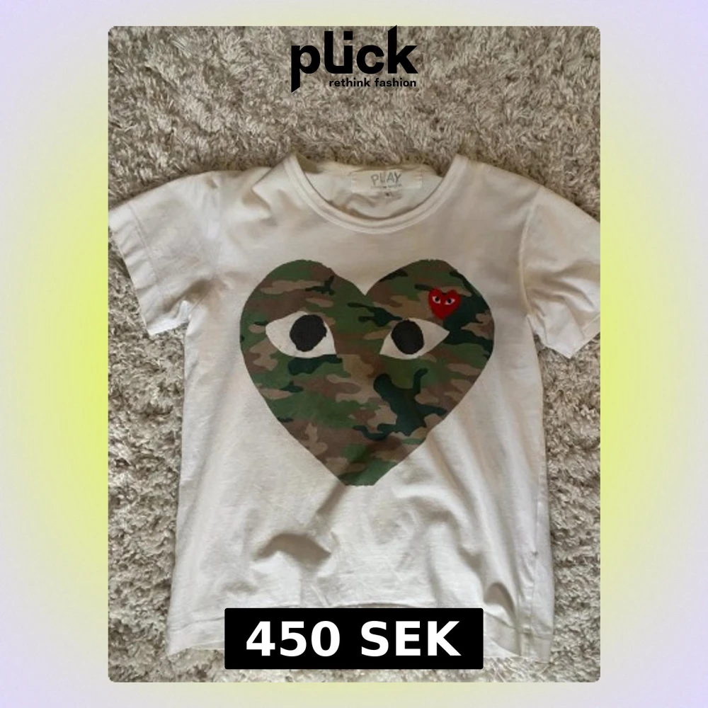 Säljer en vit t-shirt från Comme des Garçons Play i storlek S. Framsidan har ett stort hjärta med camouflage-mönster och ett mindre rött broderat hjärta med ögon. T-Shirten sitter mindre i storleken så mer S-XS. Hör av dig vid frågor eller fler bilder!