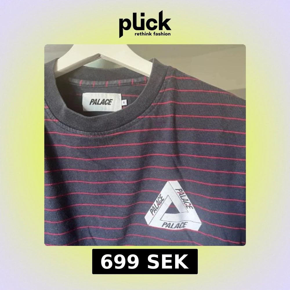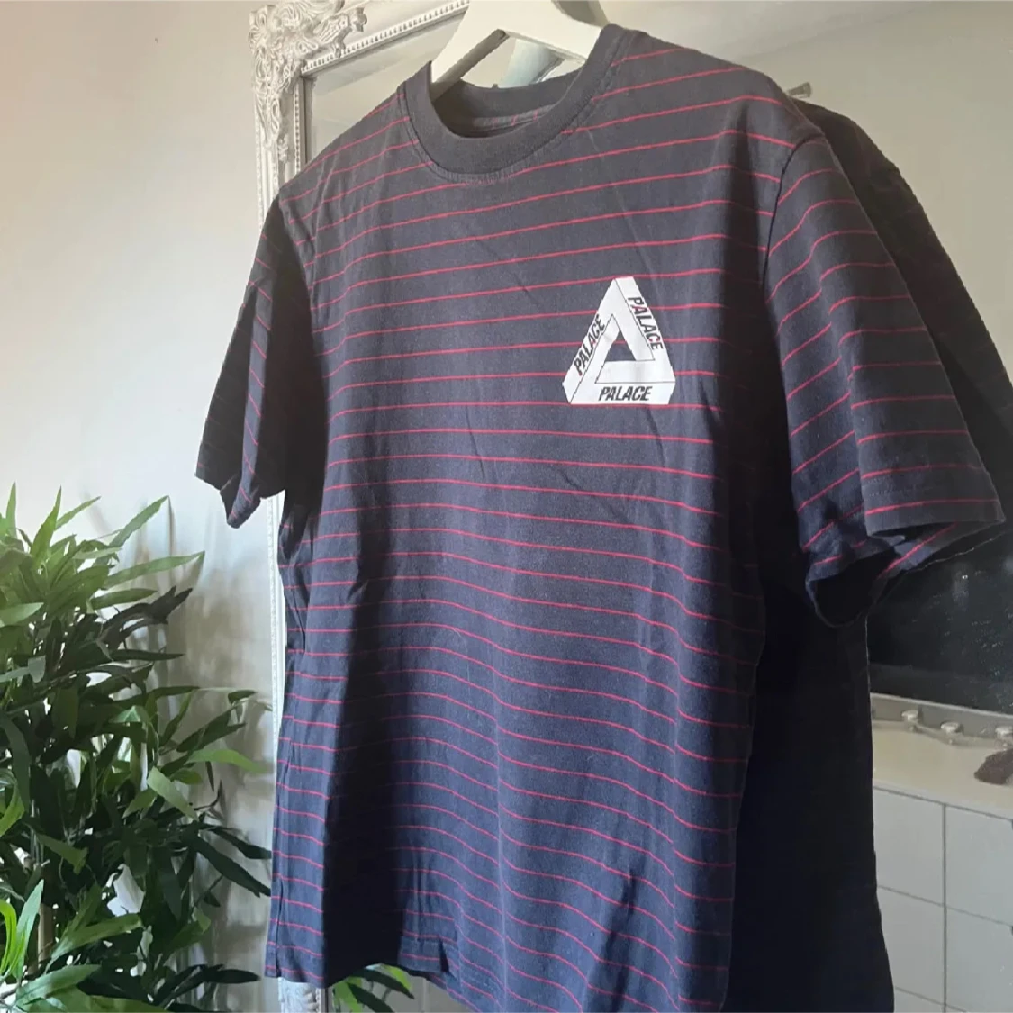 Svart t-shirt från Palace med tunna röda ränder och klassisk Tri-Ferg-logga tryckt på bröstet. Rund hals och korta ärmar. Skön bomullskvalitet och regular fit, perfekt för dig som gillar streetwear och vill sticka ut med en snygg detalj. Hej jag säljer en lite äldre palace t-shirt som köptes på Herr Judit hornsgatan. Tröjan är i bra skick och har varit sparsamt använd, nypris 1500. Skriv för fler bilder & frågor.