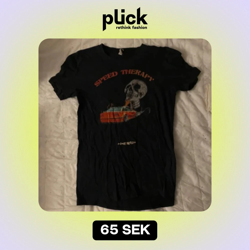 Cool svart t-shirt med tryck av en dödskalle och en röd bil. Texten 'Speed Therapy' ger en edgy vibe. Perfekt för en avslappnad stil eller en utekväll. T-shirten är kortärmad och verkar vara i bomull, vilket gör den bekväm att bära.