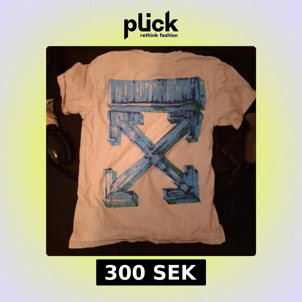Säljer en vit t-shirt från Off-White med ett stort blått och grönt grafiskt tryck på baksidan. Framsidan har en enkel Off-White-logga. Perfekt för dig som gillar streetwear och vill ha något unikt i garderoben.