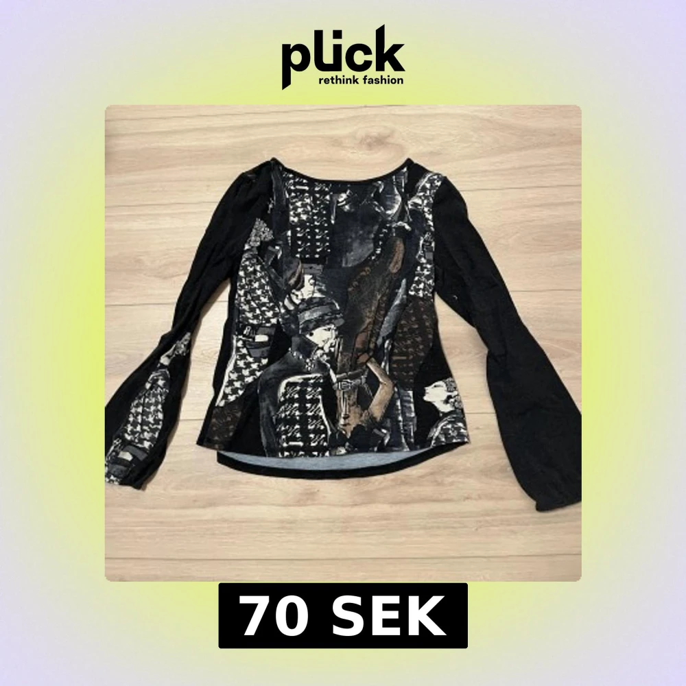 Unik svart topp med ett konstnärligt mönster i olika nyanser av brunt och beige. Toppen har långa ärmar och en rund halsringning. Perfekt för dig som vill ha något annorlunda i garderoben.