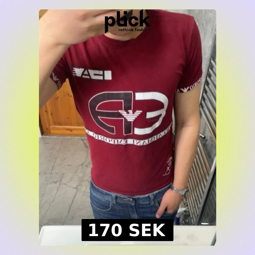 Säljer en vinröd EA7 t-shirt från Emporio Armani med stort vitt och svart tryck på bröstet och logga på ärmen. T-shirten har rund hals och korta ärmar. Perfekt för dig som gillar streetwear och vill sticka ut med en snygg logga.