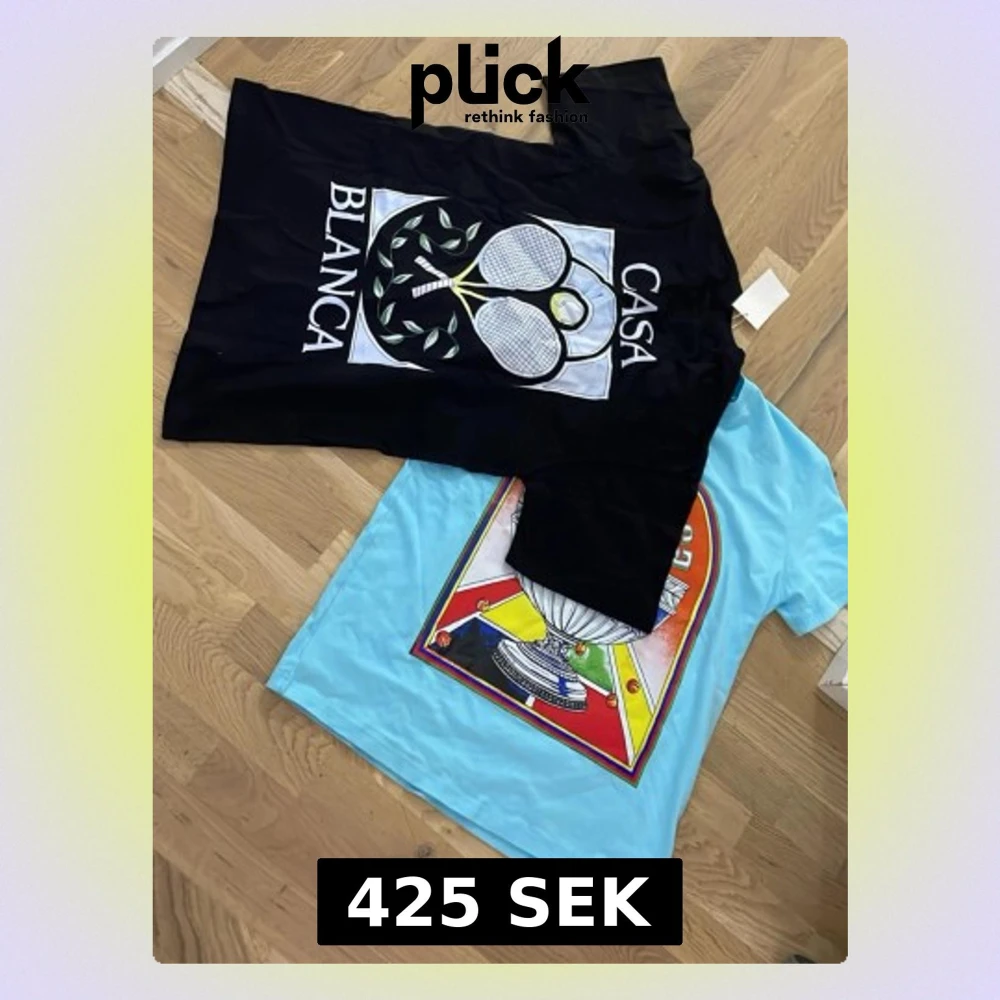 Två t-shirts från Casablanca, en svart med stort grafiskt tennistryck och texten 'Casa Blanca', och en ljusblå med färgglatt tryck och 'Casablanca Tennis Club'. Båda har rund hals och korta ärmar. Perfekta för dig som gillar unika prints och sportig stil.
