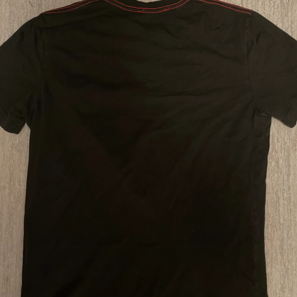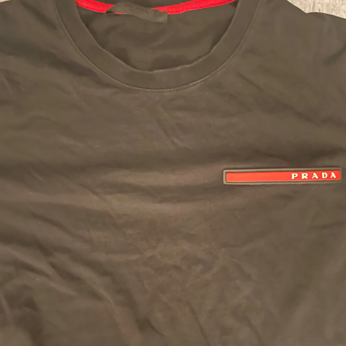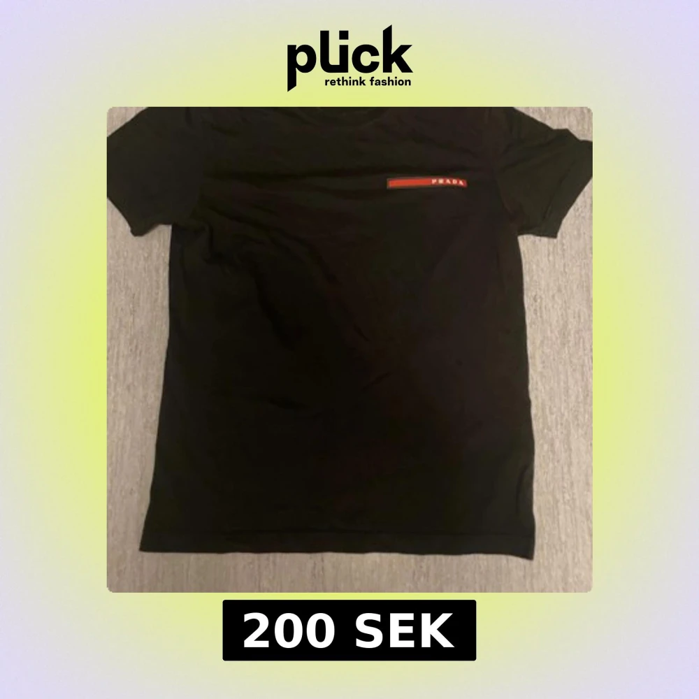 Svart t-shirt med Prada tryck. Kan inte garantera äkthet därav priset & litet hål i fram som syns på första bilden, kan nog lätt sys igen snabbt men vill bli av med den. Skriv vid frågor!