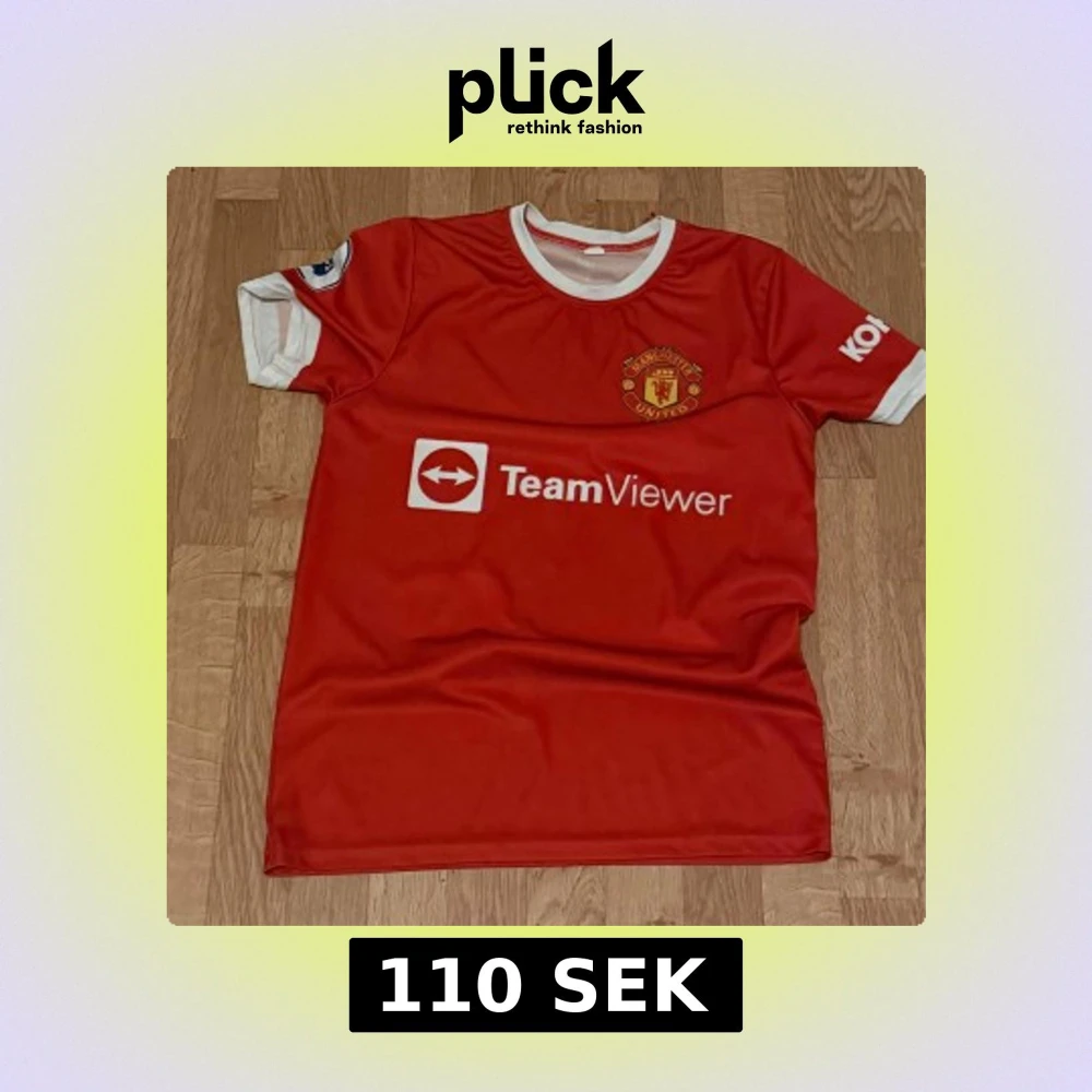 Säljer en röd Manchester United fotbollströja med vita detaljer, TeamViewer sponsortryck och klubbmärke på bröstet. På ryggen står Rashford och nummer 10 i vitt. Kortärmad modell i lätt och ventilerande material, perfekt för match eller träning.