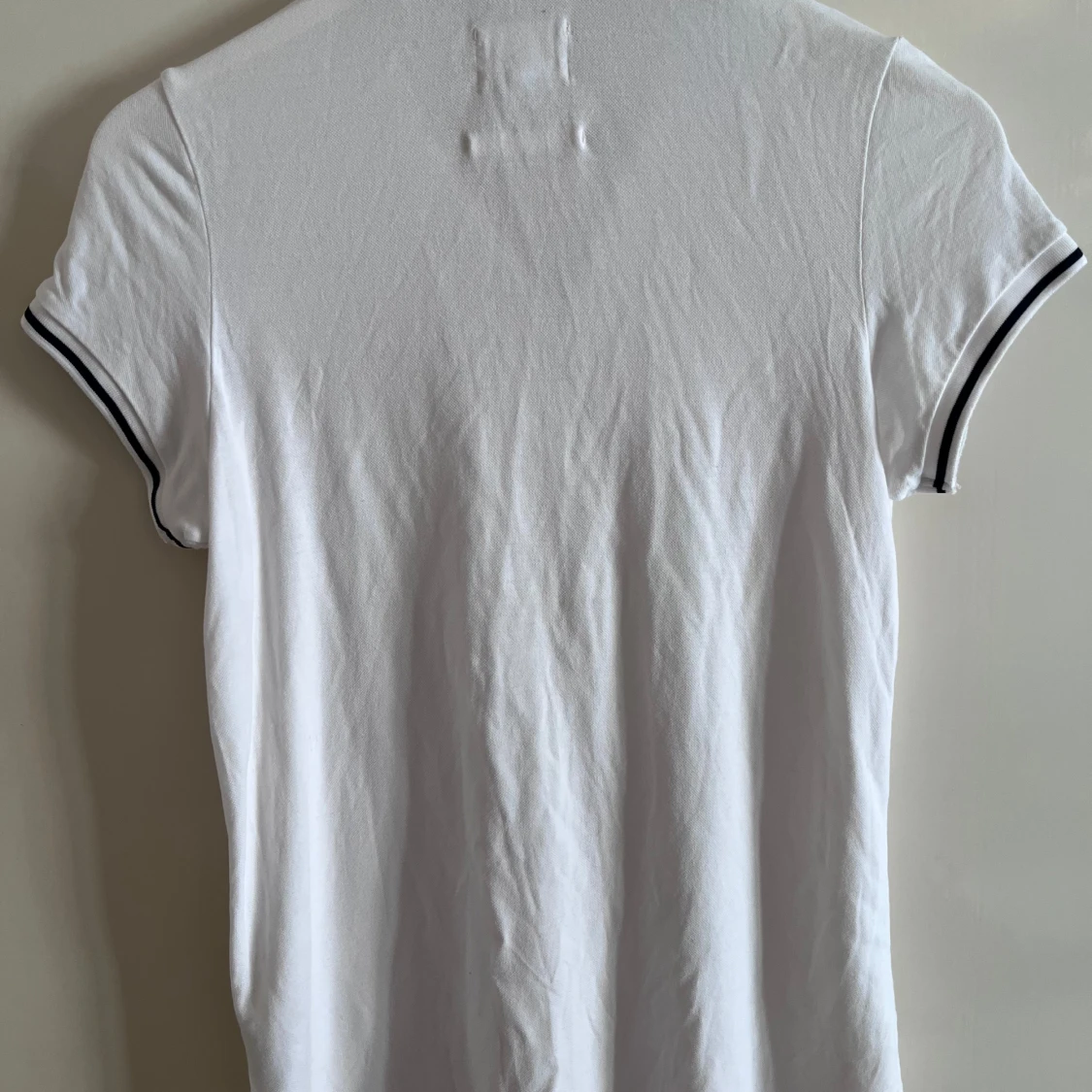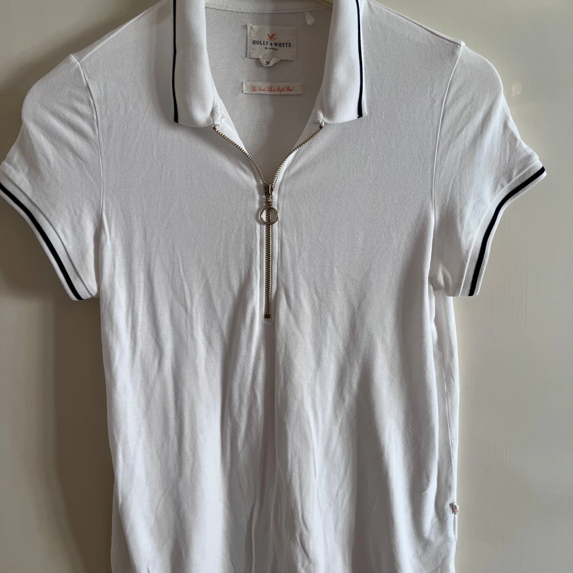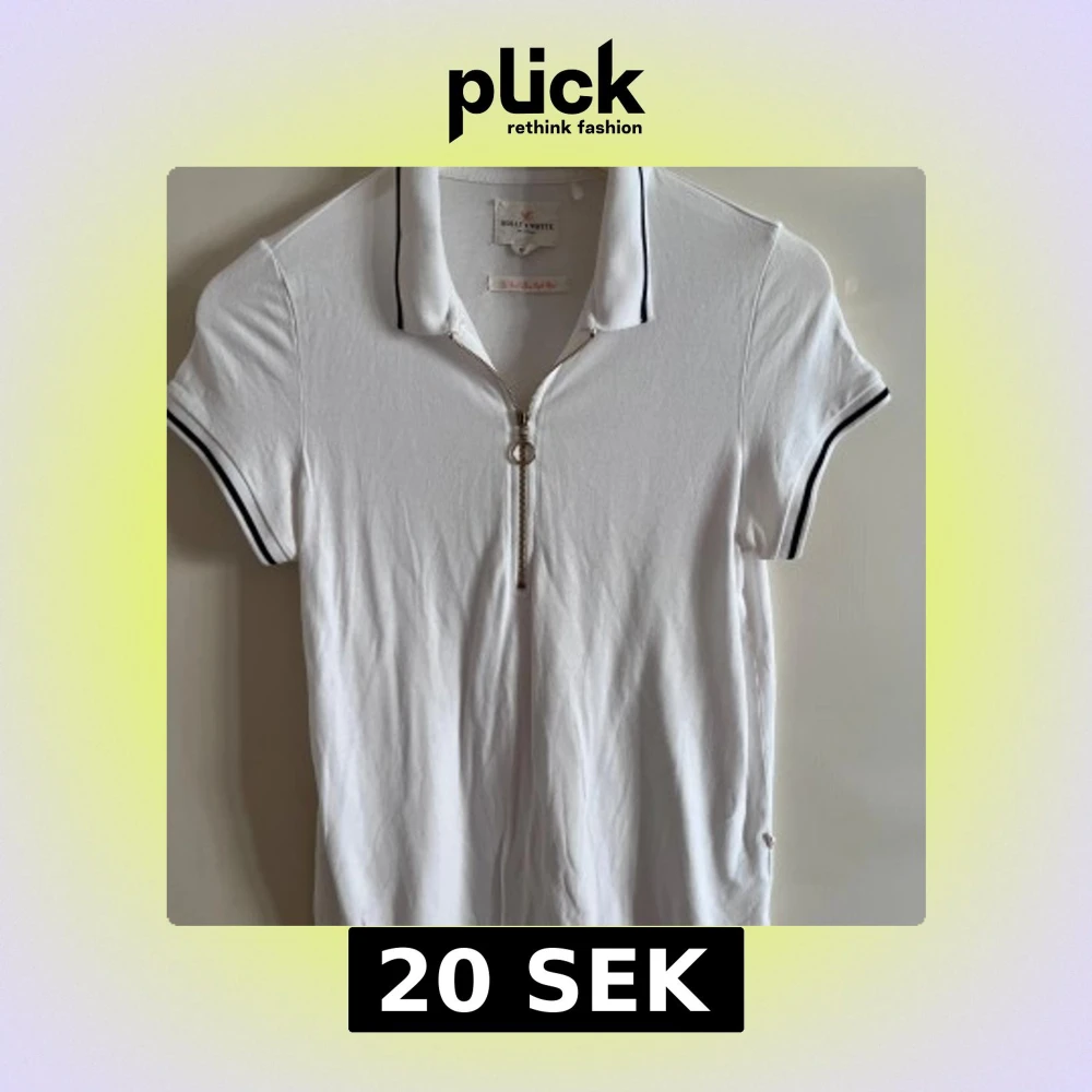 Vit piké-tshirt med svart kant på krage och ärmslut. Dragkedja framtill med ringdetalj. Klassisk och sportig look, perfekt till jeans. Mjukt bomullsmaterial som känns skönt mot huden.