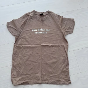 Säljer en beige t-shirt med texten 'you drive me coconuts' tryckt på framsidan. T-shirten har en avslappnad passform och korta ärmar, perfekt för en casual look.