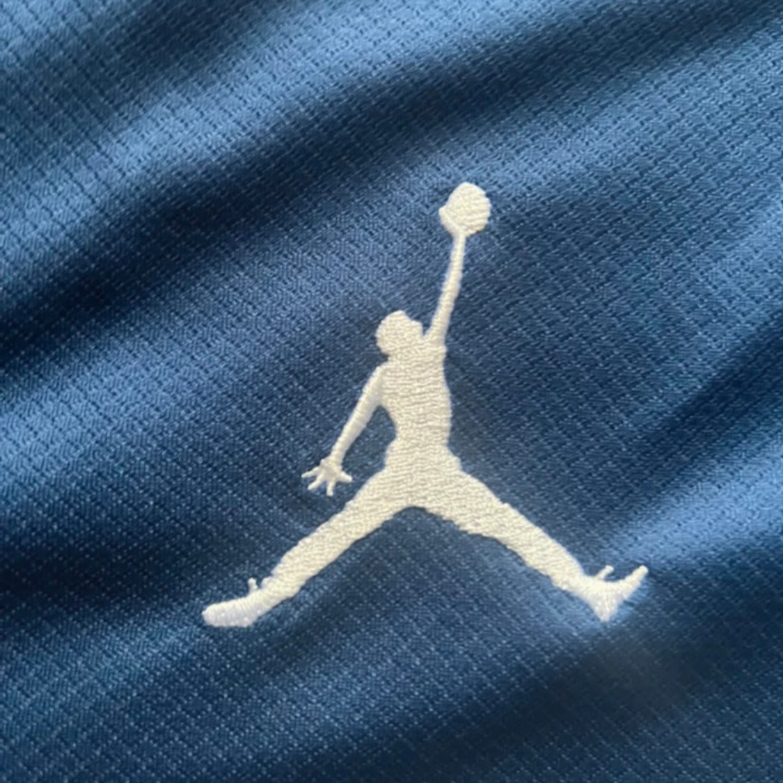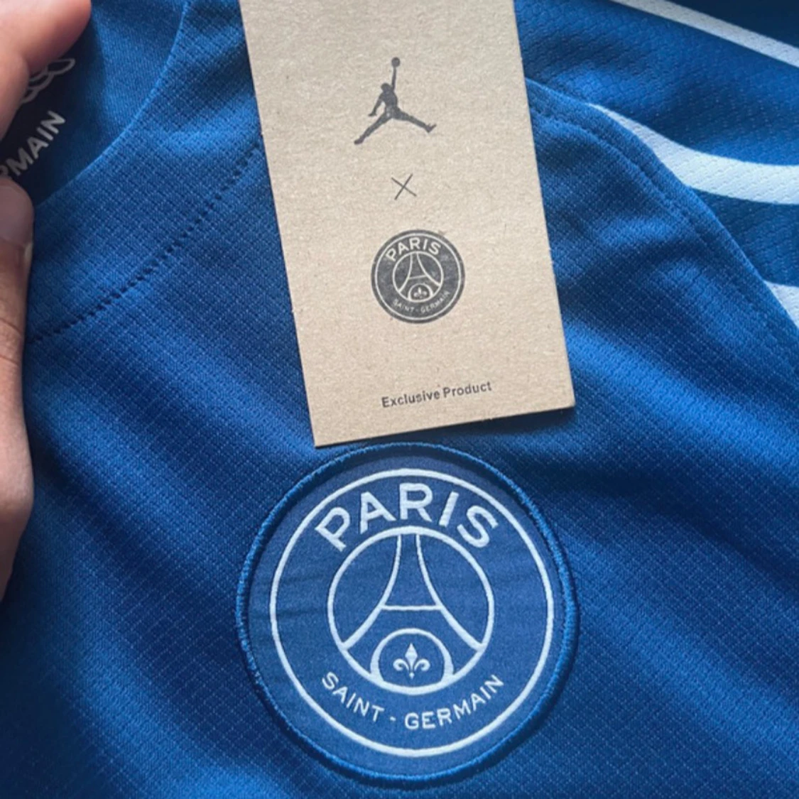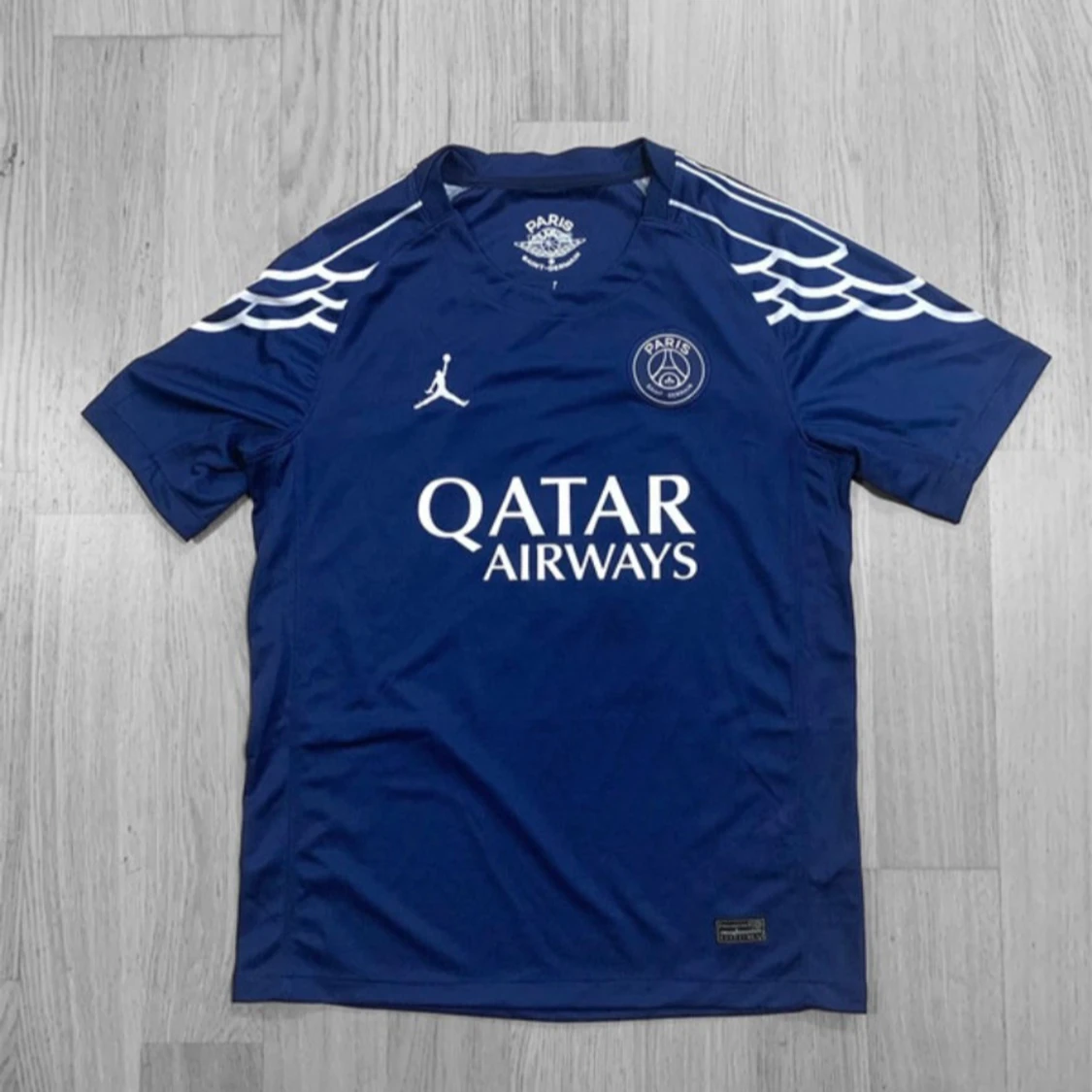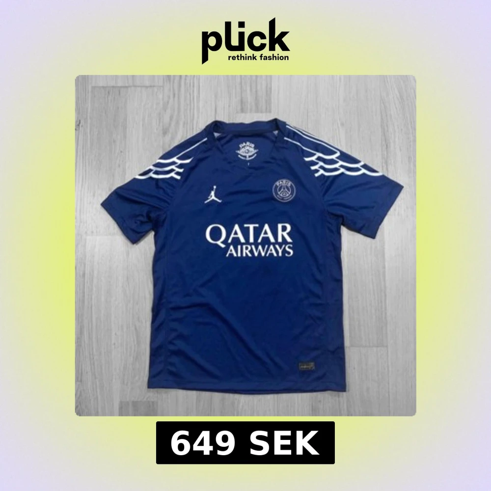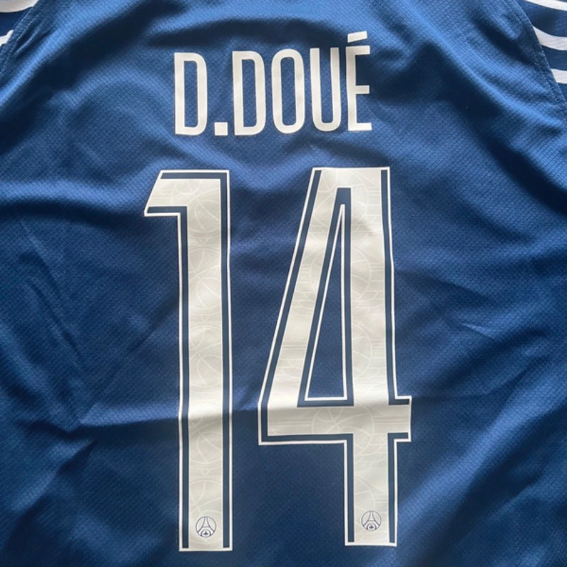 Snygg PSG fotbollströja i mörkblått med vita detaljer och tryck. Jordan-logga på bröstet, Qatar Airways sponsor och PSG-emblem. Unikt mönster på axlarna, Champions League-märke på ärmen och D. Doué #14 på ryggen. Tillverkad i lätt och ventilerande material.