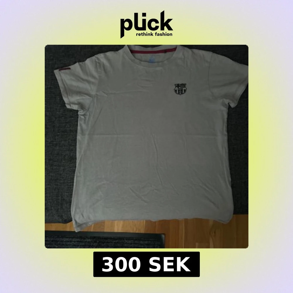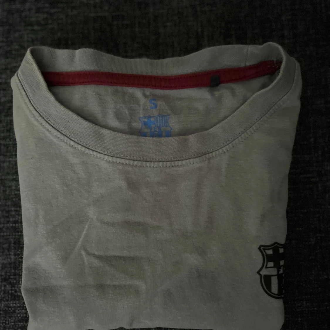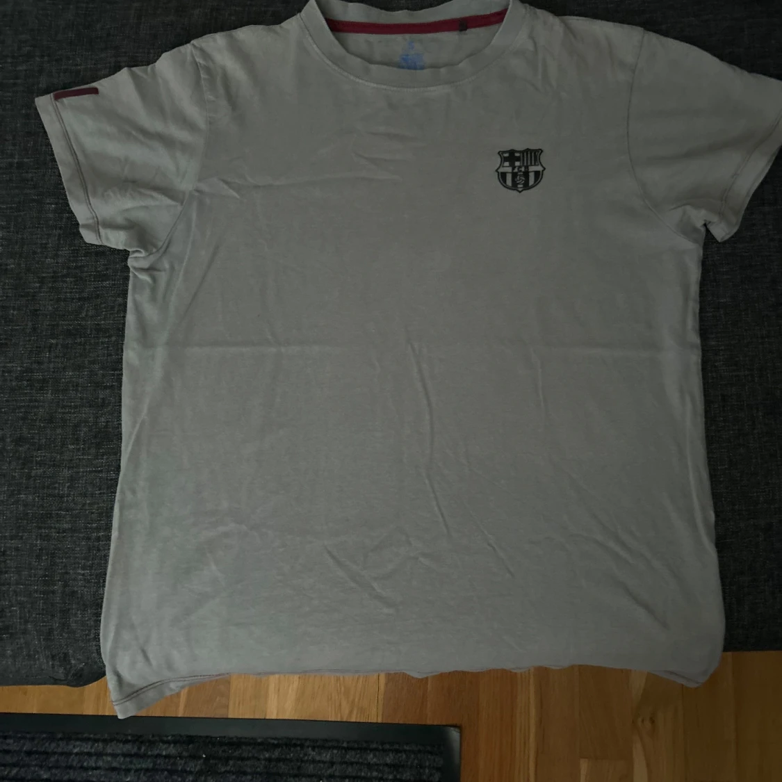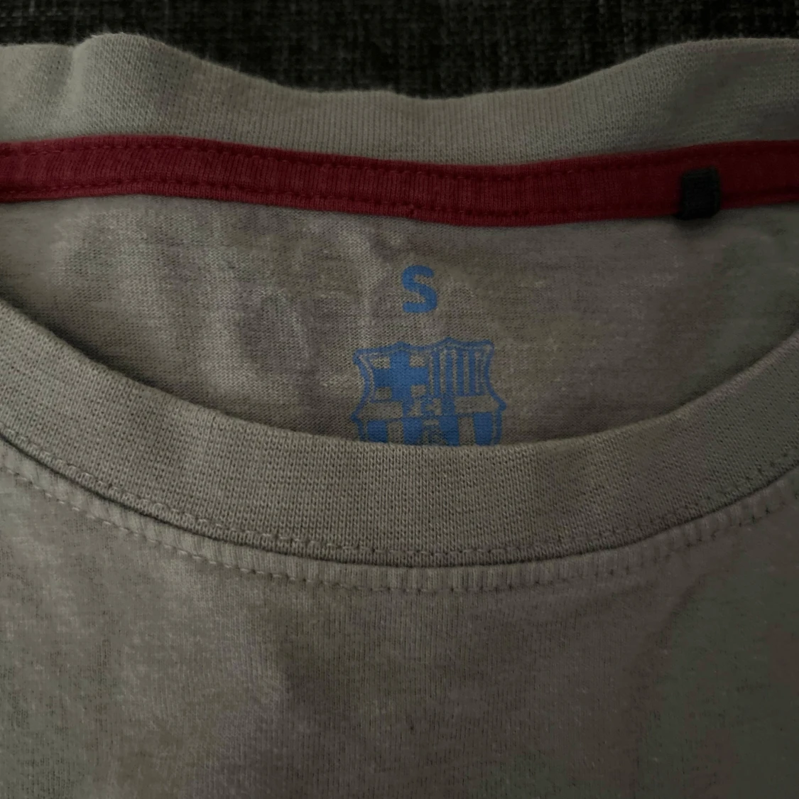 Snygg grå t-shirt från FC Barcelona med klubbens emblem tryckt på bröstet. Klassisk rund hals och korta ärmar, med en diskret röd detalj på insidan av kragen. Perfekt för dig som gillar fotboll och vill visa vilket lag du supportar.