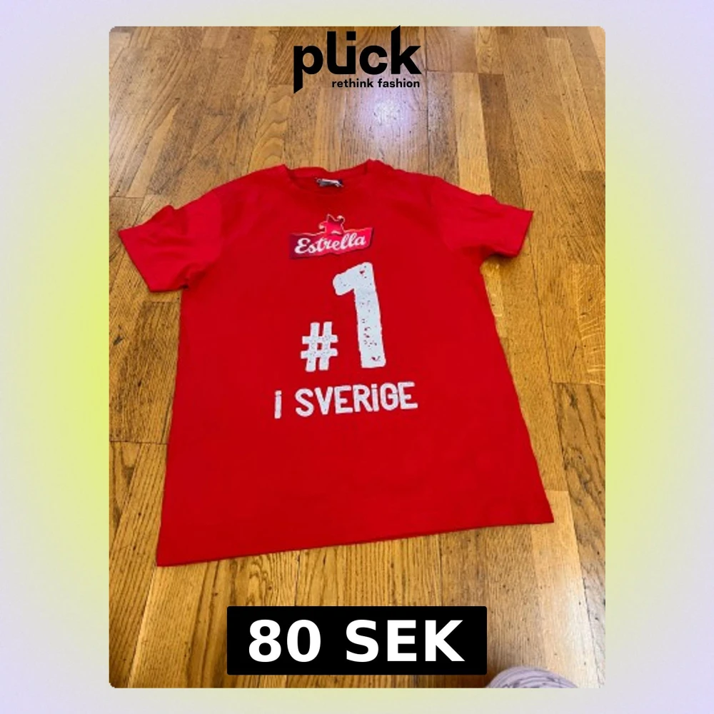 Säljer en röd t-shirt från Clique i storlek S med tryck 'Estrella #1 i Sverige' på framsidan. T-shirten har rund hals och korta ärmar, tillverkad i mjuk bomull. Perfekt för dig som gillar snacksvibes och vill sticka ut med en cool printad front.