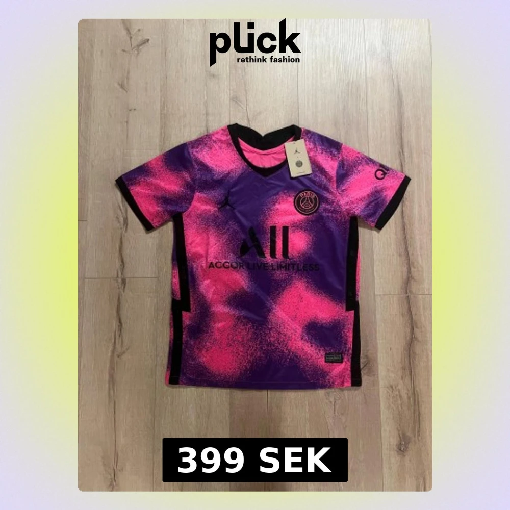 Säljer en PSG fotbollströja med Mbappé #7 på ryggen, designad av Jordan. Tröjan är kortärmad och har ett unikt mönster i lila och rosa med svarta detaljer. Materialet är lätt och andas, perfekt för match eller träning. PSG-logga och sponsortryck på bröstet.