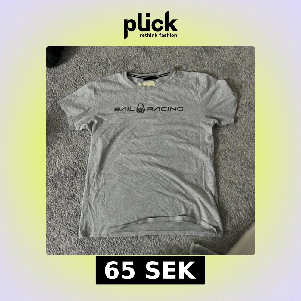 Säljer en grå t-shirt från Sail Racing med svart logga tryckt på bröstet. T-shirten har rund hals och korta ärmar. Perfekt för en avslappnad stil.