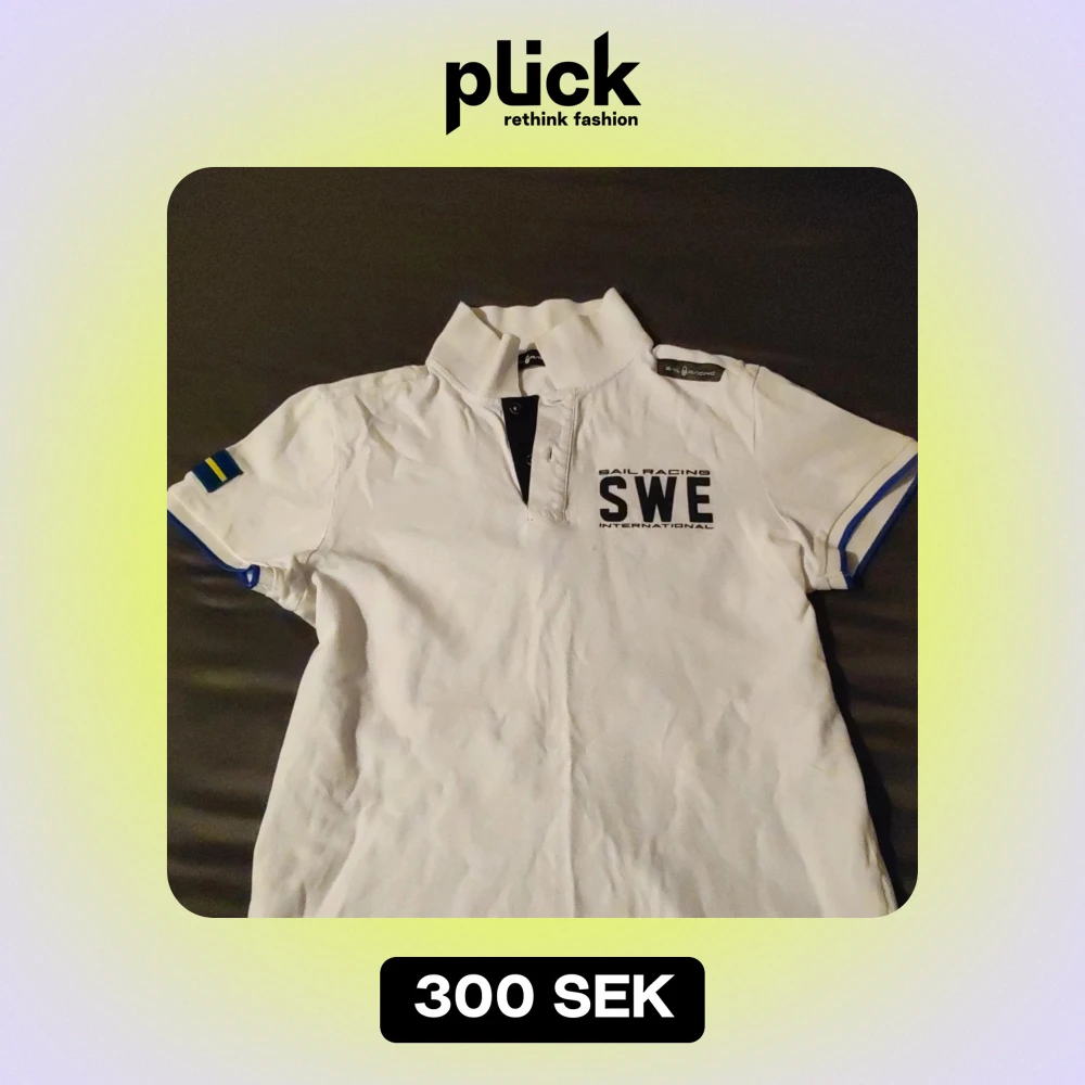 Säljer en snygg vit pikétröja från Sail Racing med texten 'SWE' tryckt på bröstet. Tröjan har korta ärmar med blå och gula detaljer samt en svensk flagga på ärmen. Perfekt för sommarens alla äventyr! 🌞