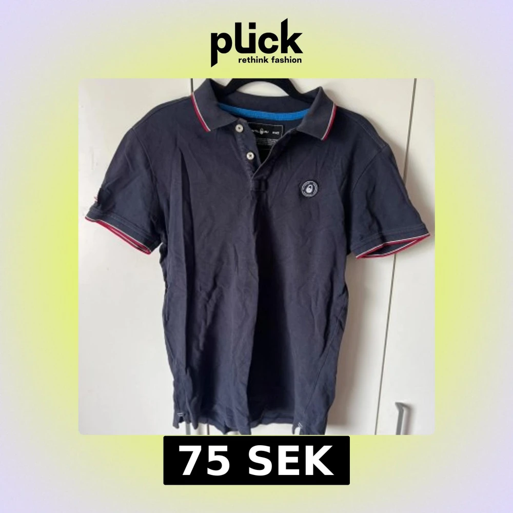 Säljer en mörkblå pikétröja från Sail racing med korta ärmar och klassisk krage. Tröjan har röda och vita detaljer på krage och ärmslut samt en broderad logga på bröstet.
