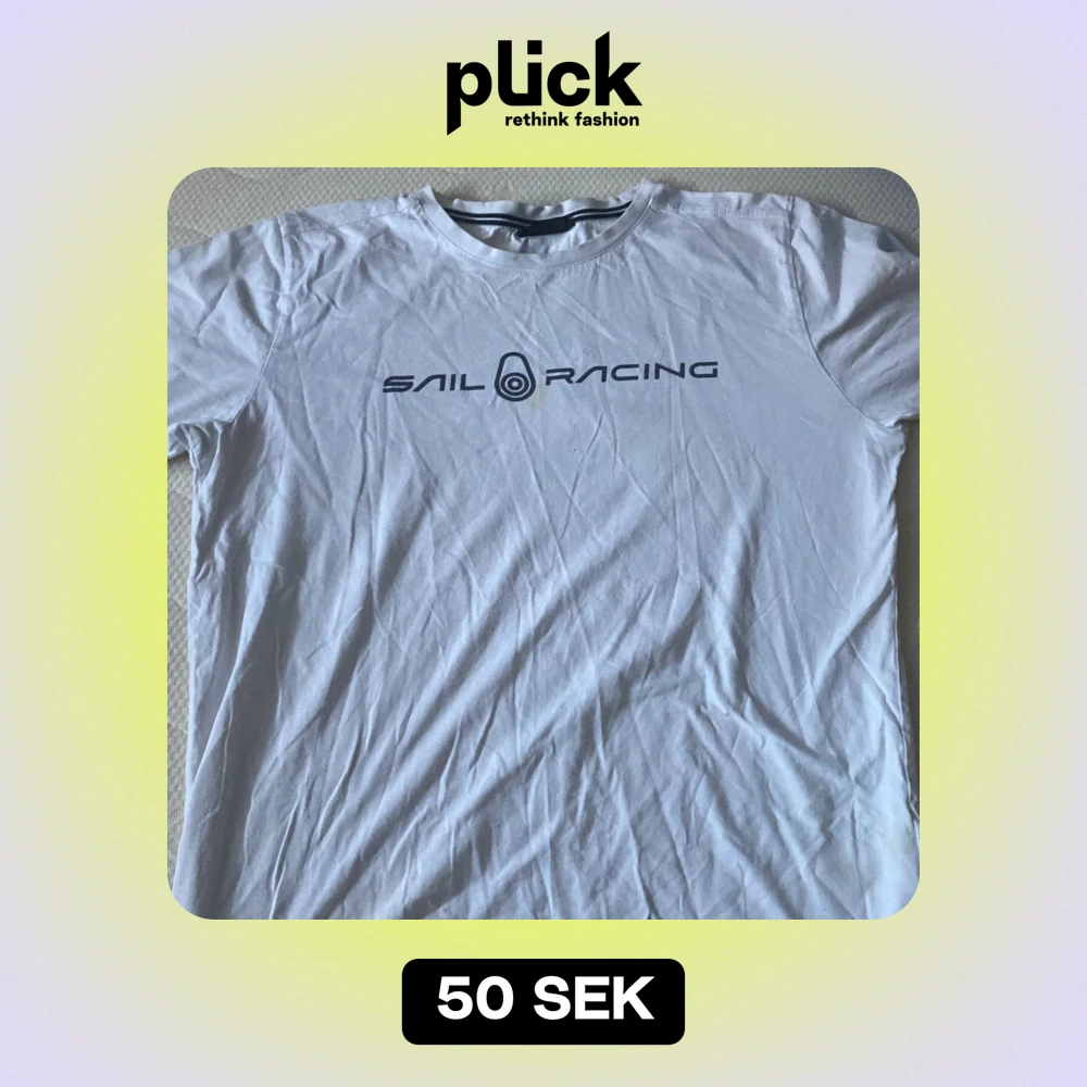 Säljer en vit t-shirt från Sail Racing i bra skick. Den har en stilren design med logotypen tryckt på framsidan och ett litet märke på baksidan. Perfekt för en avslappnad stil eller sommarens äventyr. Passar både till vardags och till träning. Har ett litet håll och en liten fläck som jag försökt tvätta bort men det går inte!🙂