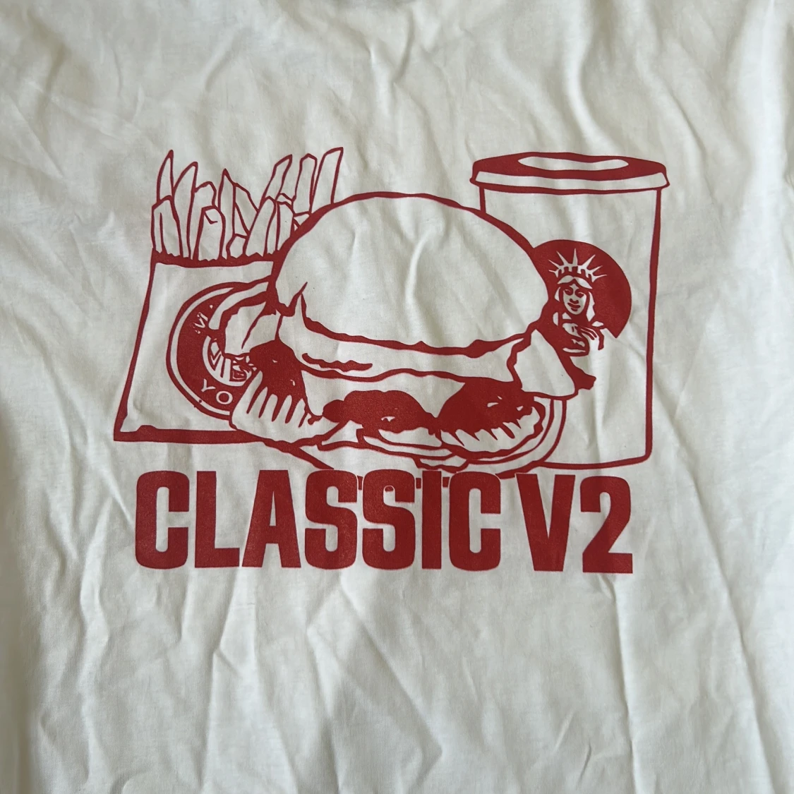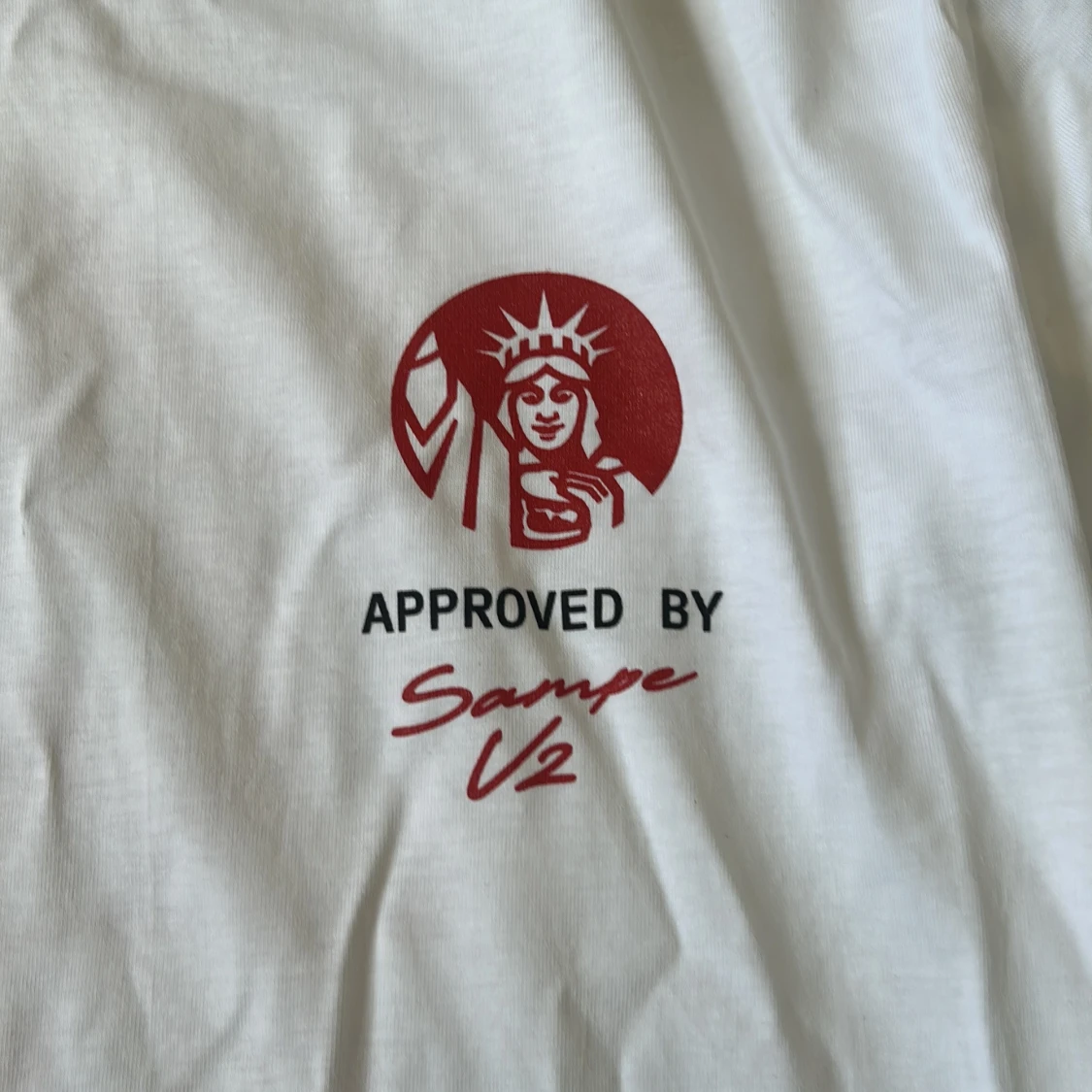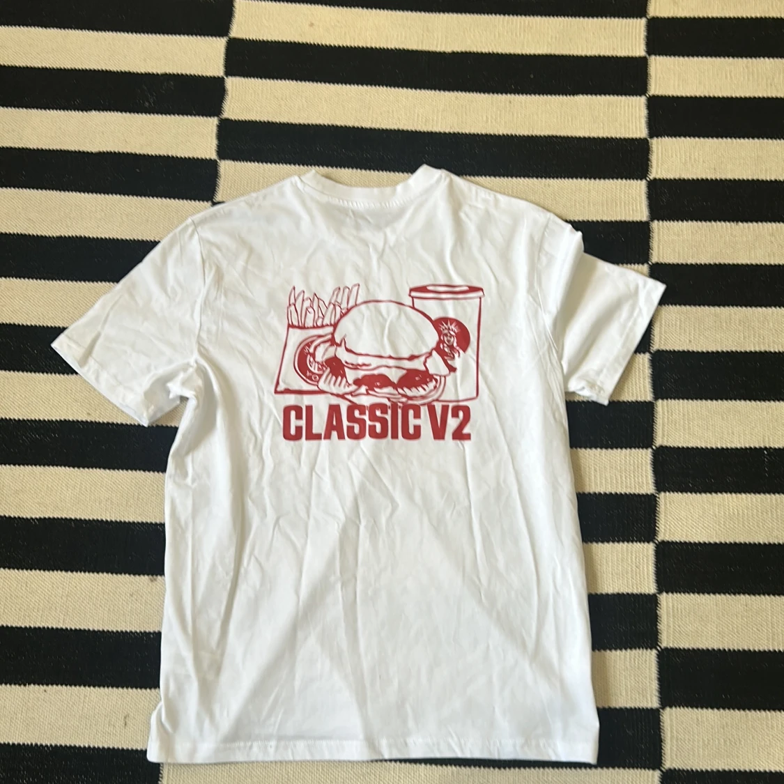 Säljer en vit t-shirt från Sampe V2 i storlek M. T-shirten har rött tryck fram med texten 'Approved by Sampe V2' och ett motiv, samt ett stort tryck bak med hamburgare, pommes och läsk samt texten 'Classic V2'. Rund hals och korta ärmar. Skön bomullskvalitet. Limited edition, endast de 10 första fick de, från moster york. Aldrig använd perfekt kvalitét och ytterst sällsynt.