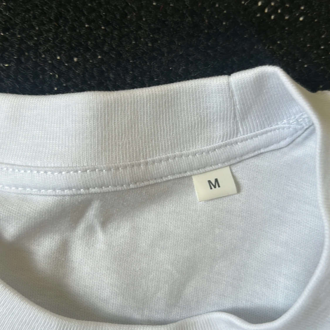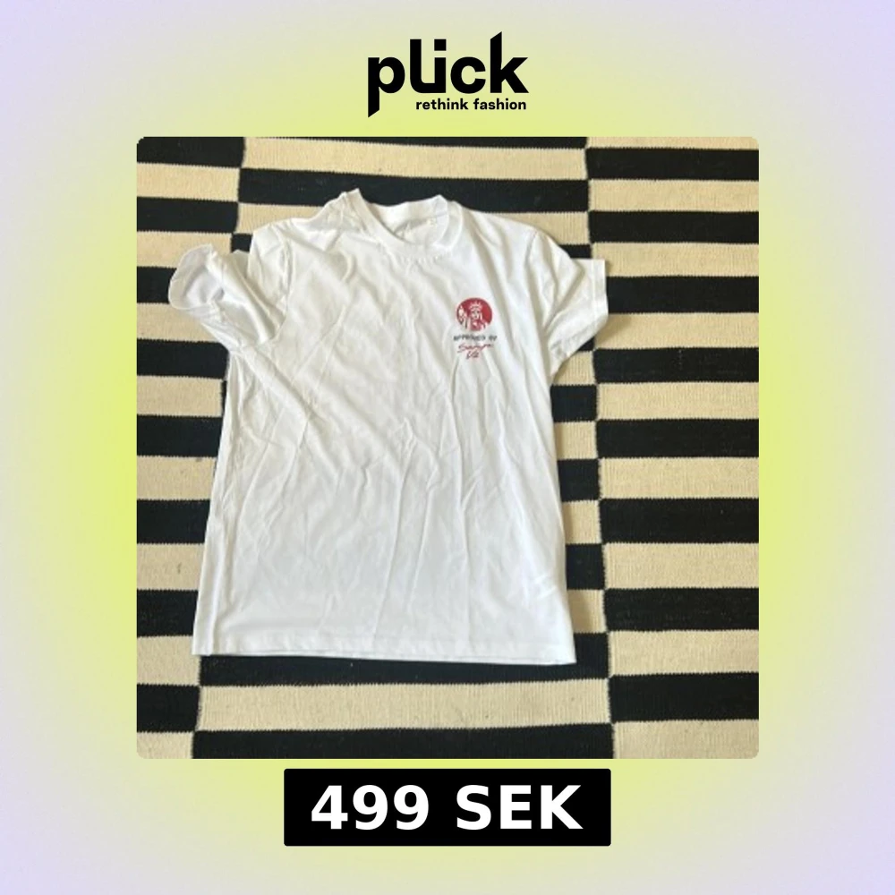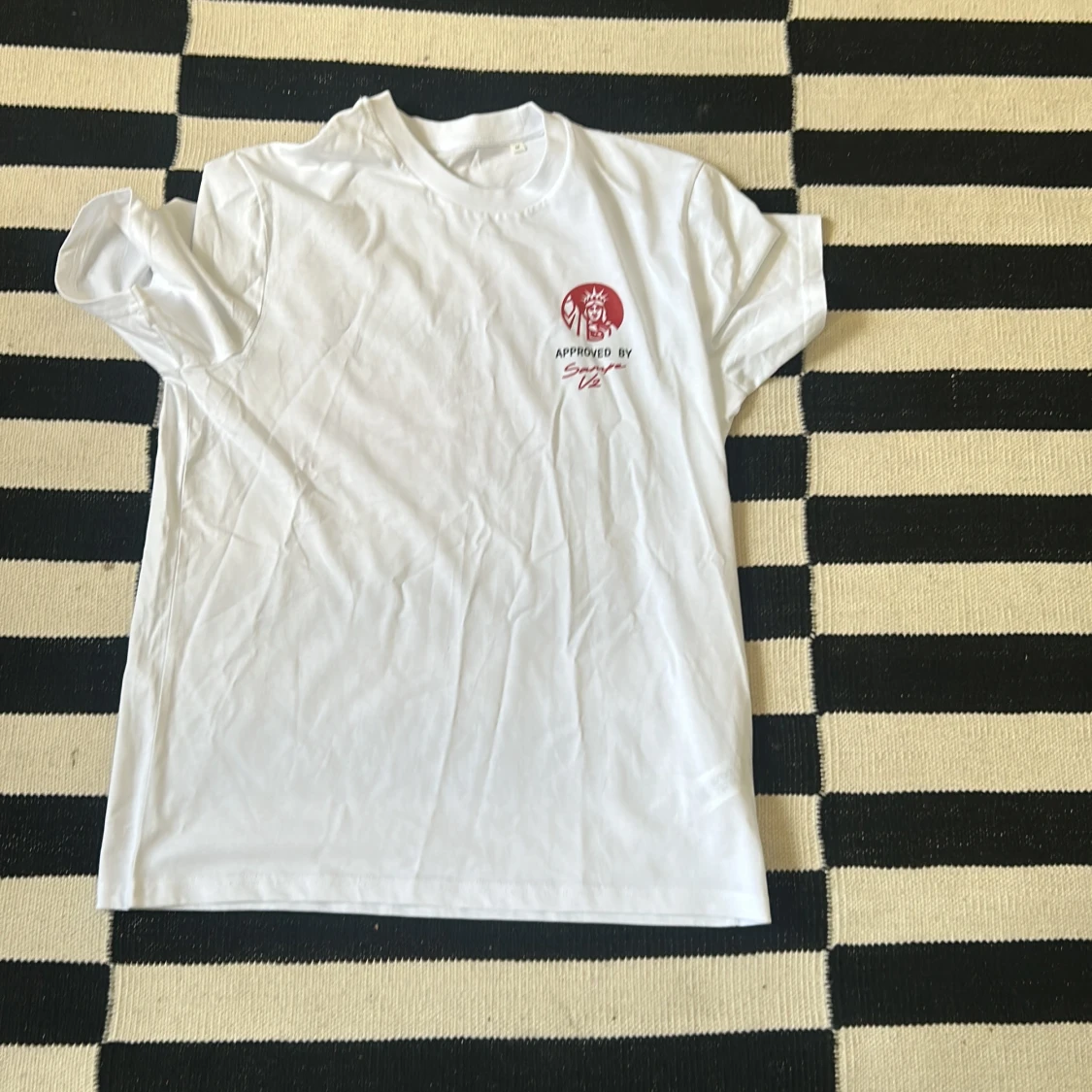 Säljer en vit t-shirt från Sampe V2 i storlek M. T-shirten har rött tryck fram med texten 'Approved by Sampe V2' och ett motiv, samt ett stort tryck bak med hamburgare, pommes och läsk samt texten 'Classic V2'. Rund hals och korta ärmar. Skön bomullskvalitet. Limited edition, endast de 10 första fick de, från moster york. Aldrig använd perfekt kvalitét och ytterst sällsynt.
