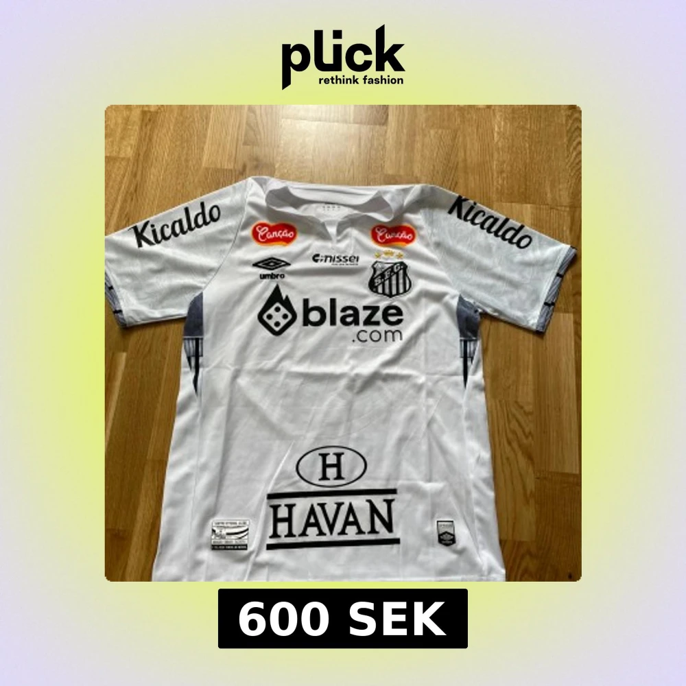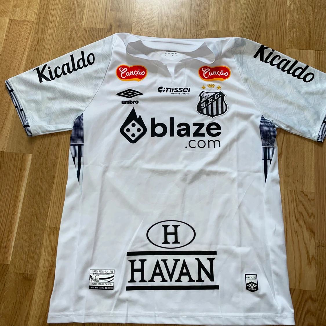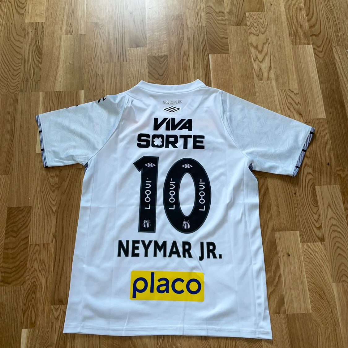 Vit Santos FC fotbollströja med Neymar Jr. och nummer 10 på ryggen. Tröjan har svarta tryck, flera sponsorer och klubbmärke på bröstet. Tillverkad i lätt och ventilerande material, perfekt för match eller träning. Klassisk passform med korta ärmar och subtilt mönster i tyget.