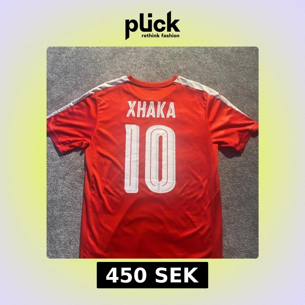 Röd Schweiz fotbollströja med Xhaka och nummer 10 på ryggen. Puma-logga, Schweiz flagga och ASF/SFV-emblem på bröstet. Vita detaljer på axlar och krage. Tillverkad i lätt och ventilerande material, perfekt för match eller träning. Inte använd så mycket. Skick 10/10✅ storlek M📏