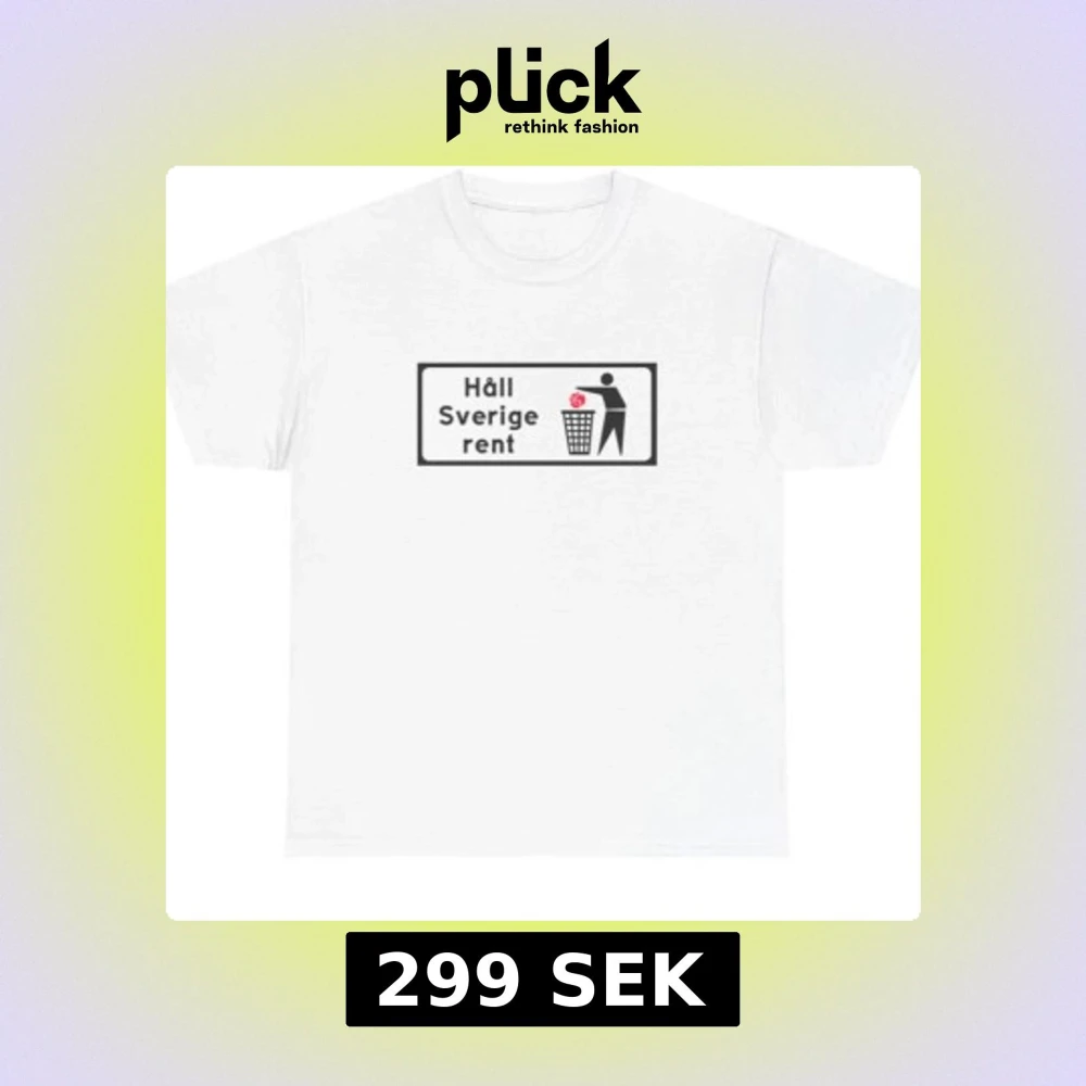 Vit t-shirt med rund hals och korta ärmar. På bröstet finns ett svart tryck med texten 'Håll Sverige rent' och en figur som slänger sossarna i soporna