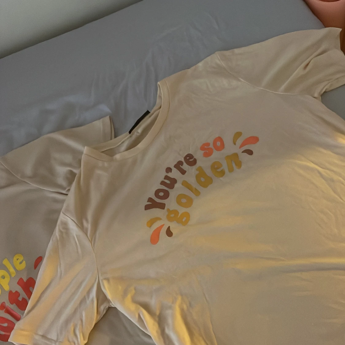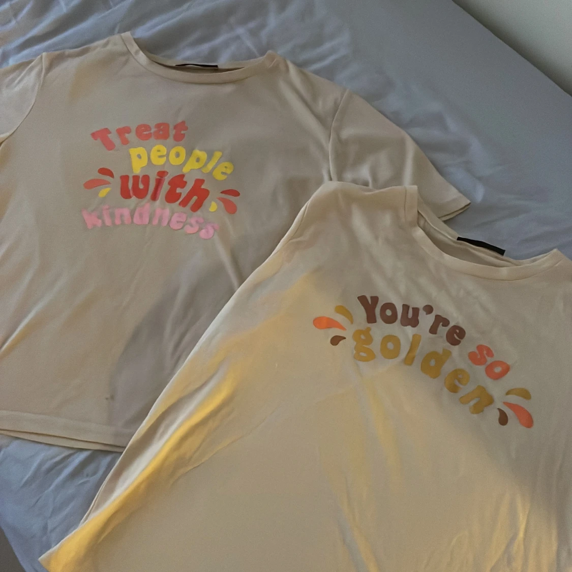Jag säljer mina två supermjuka t-shirts. Båda har citat från Harry Styles låtar🥰 Perfekt om du gillar Harry eller bara vill ha sköna tröjor att kunna ha hemma tex. Den ena har en liten fläck där nere därav priset. Sitter normalt, pris för båda‼️