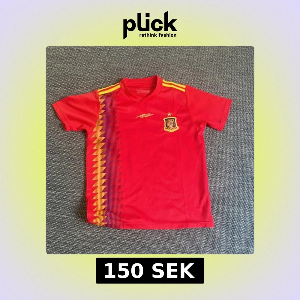Röd kortärmad fotbollströja från Luanvi med Spaniens landslagsemblem på bröstet. Tröjan har gula och blå grafiska detaljer längs ena sidan samt gula ränder på axlarna. Perfekt för fotbollsfans!