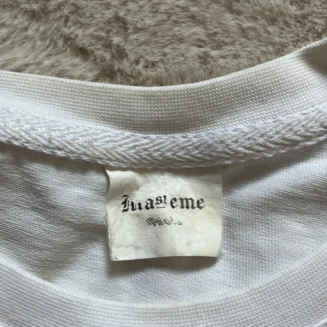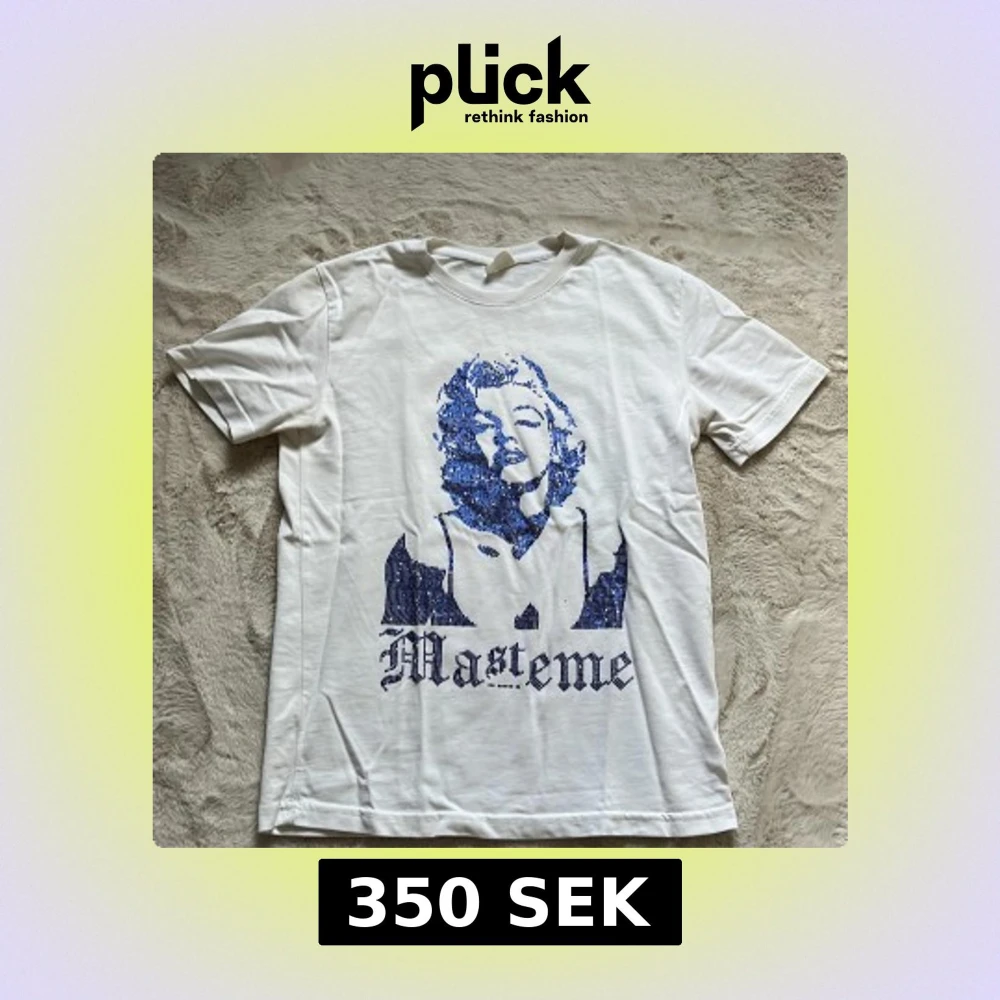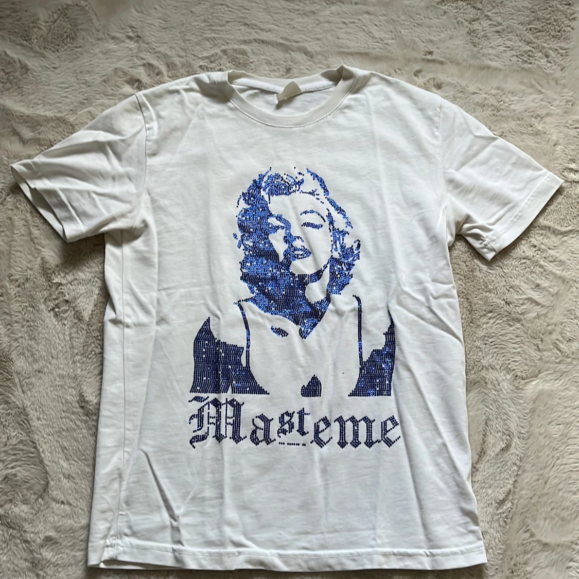 Vit t-shirt från Mastemé med blått tryck av ikonisk person och text på framsidan. Klassisk passform med rund hals och korta ärmar. Perfekt för dig som gillar streetstyle och coola prints.