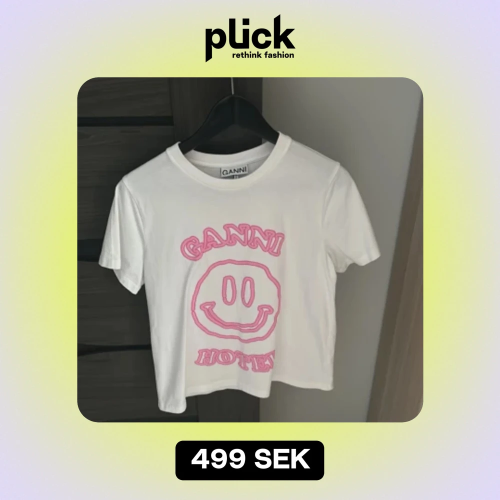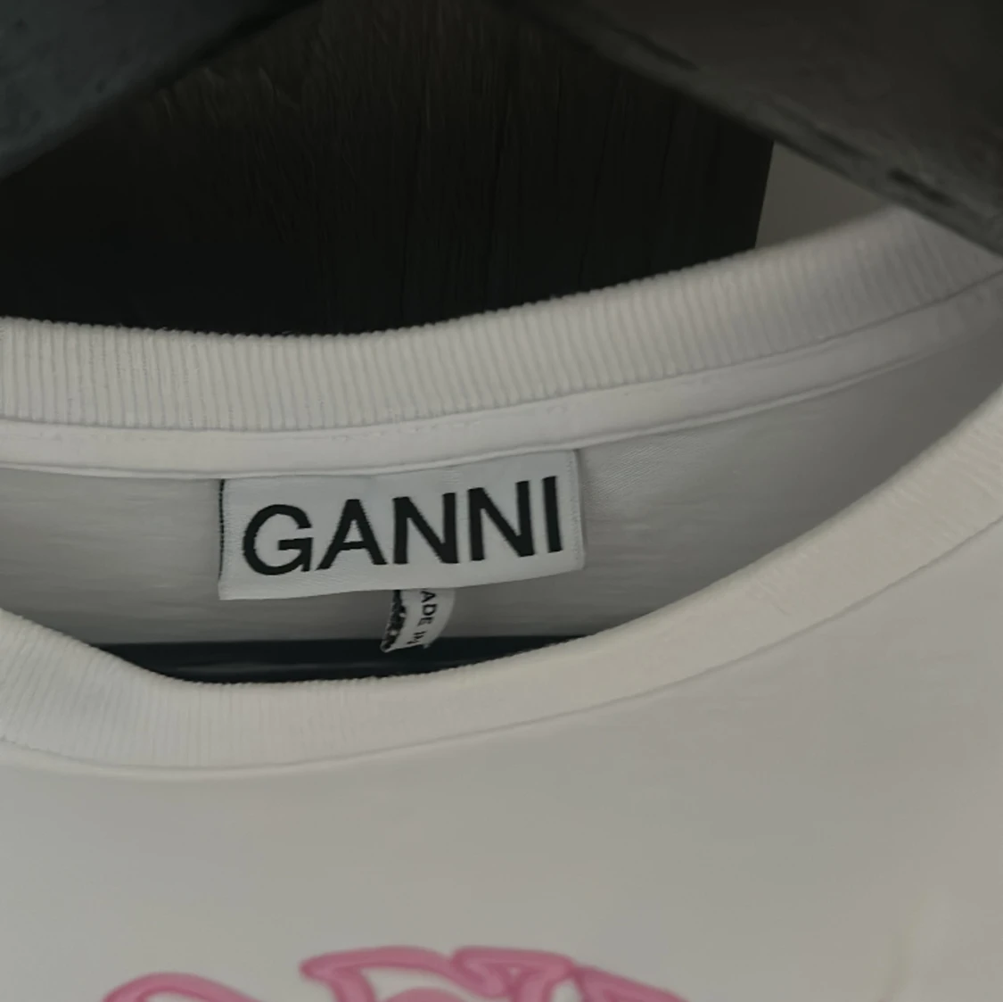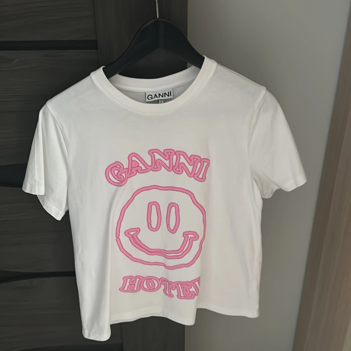 Jätte fin och unik Ganni t-shirt som köptes för 1100kr💕Storlek S men passar XS o M🥰 Inga skador eller fläckar, super fin kvalitet!✨Köparen står för frakten!