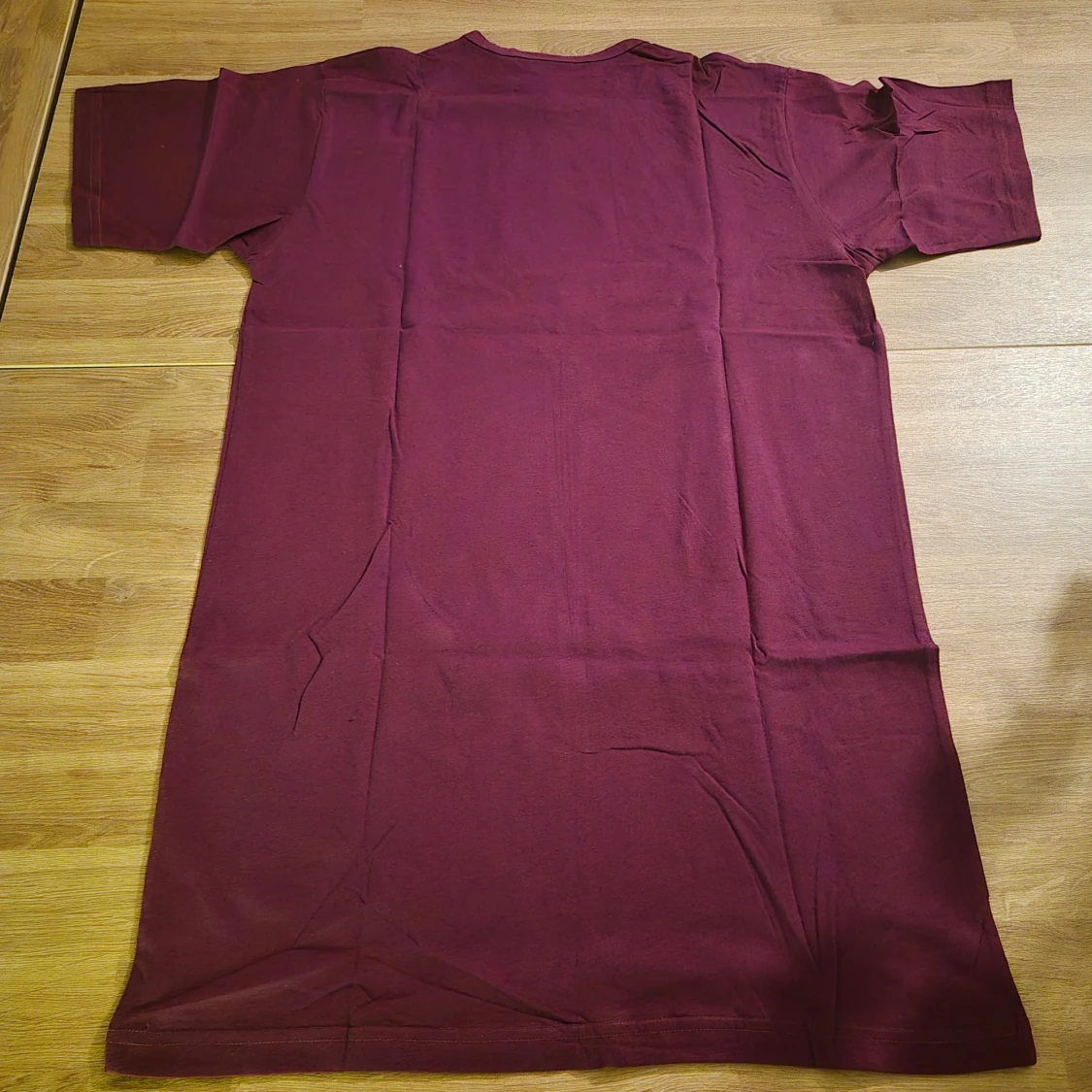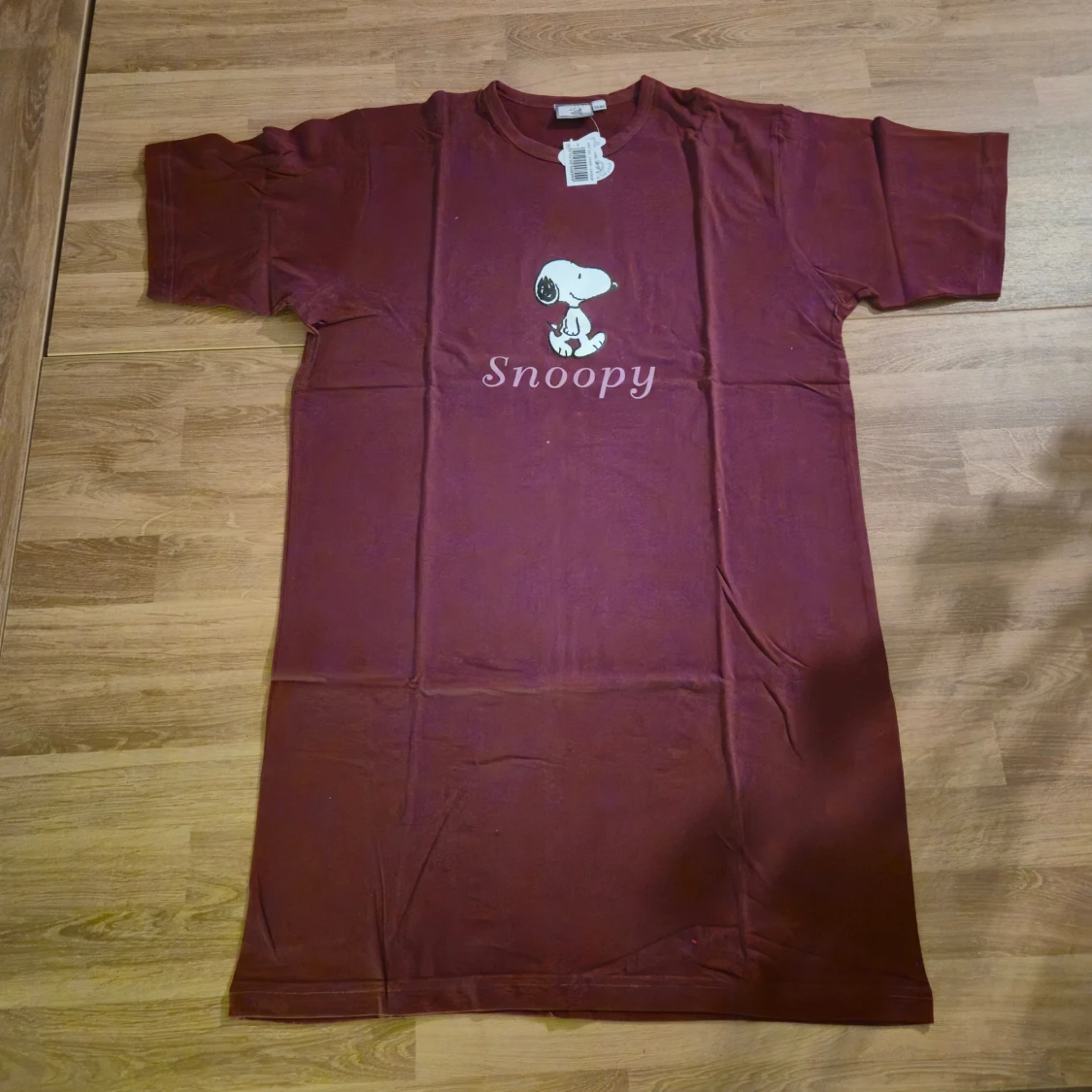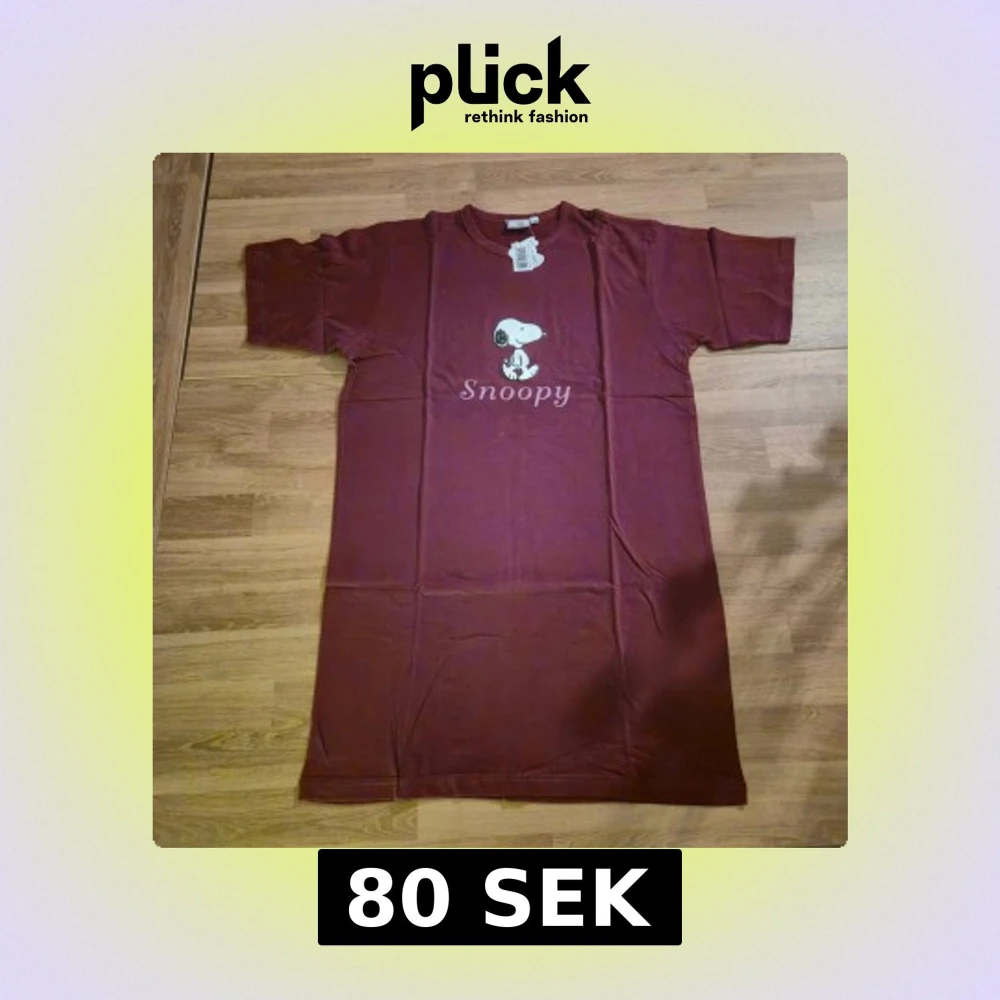 Säljer en vinröd t-shirt med tryck av Snoopy på bröstet. Kan nog också användas som nattlinne eller pyjamasöverdel beroende på storlek. T-shirten är gjord i 100% bomull och har en klassisk rund hals samt korta ärmar. Passformen är normal och materialet är mjukt och skönt mot huden. Perfekt för dig som gillar Peanuts och vill ha en chill stil. Varan är helt oanvänd med etiketten kvar.