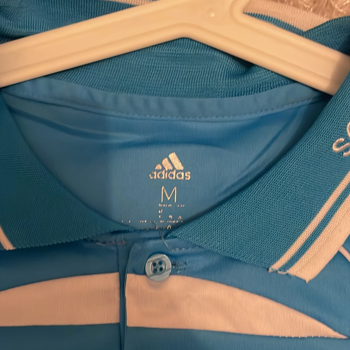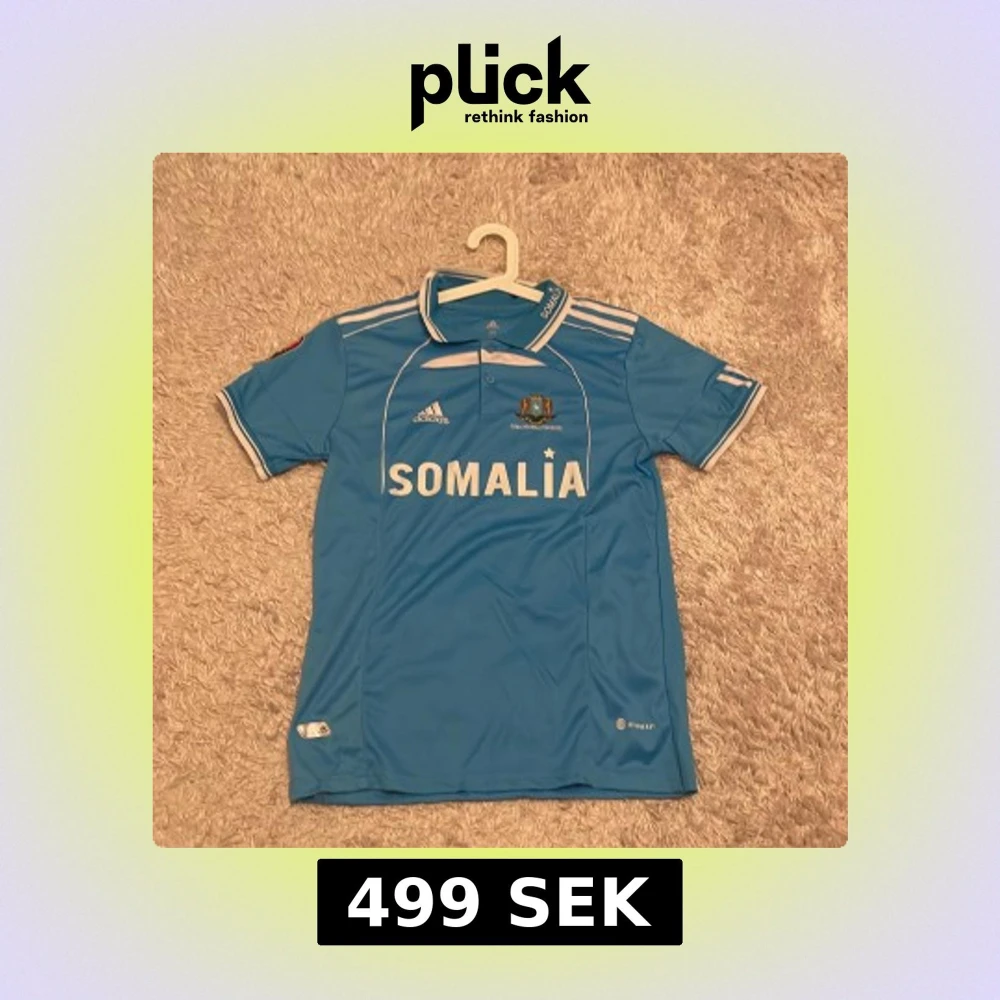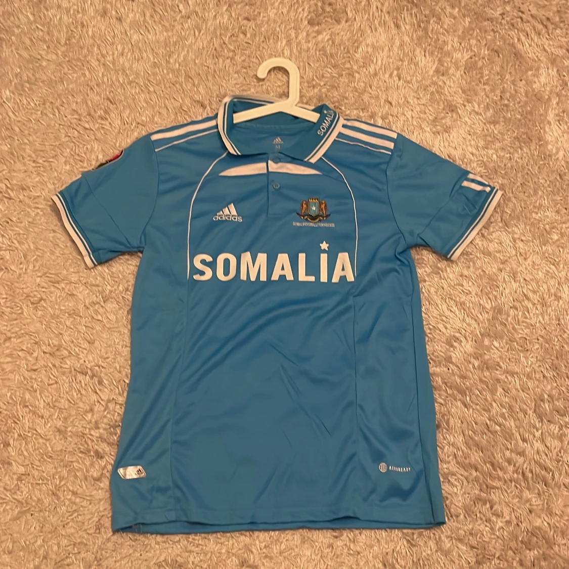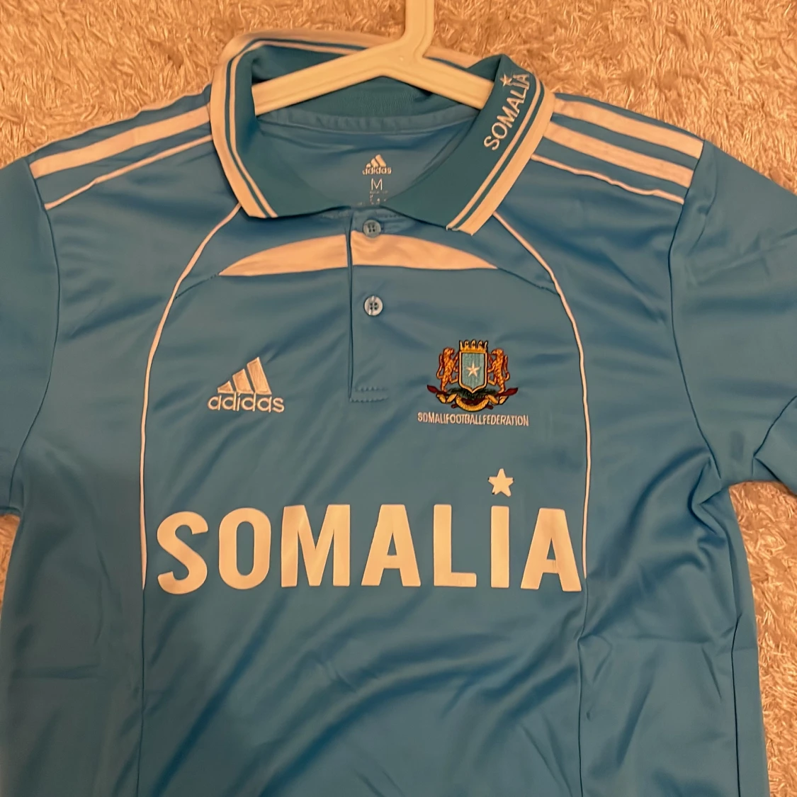 Blå Somalia fotbollströja från Adidas med vit text och detaljer. Tröjan har klassisk krage med knappar, broderat landslagsemblem och Adidas-logga på bröstet. Tillverkad i lätt och ventilerande material, perfekt för match eller träning. tröjan är som storlek S