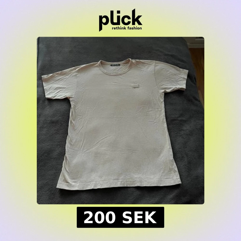 Säljer en stilren beige t-shirt från Acne Studios. T-shirten har en enkel design med en liten fyrkantig patch på bröstet. Perfekt för en minimalistisk look. Säljer då den inte kommer till någon användning. Storlek S!