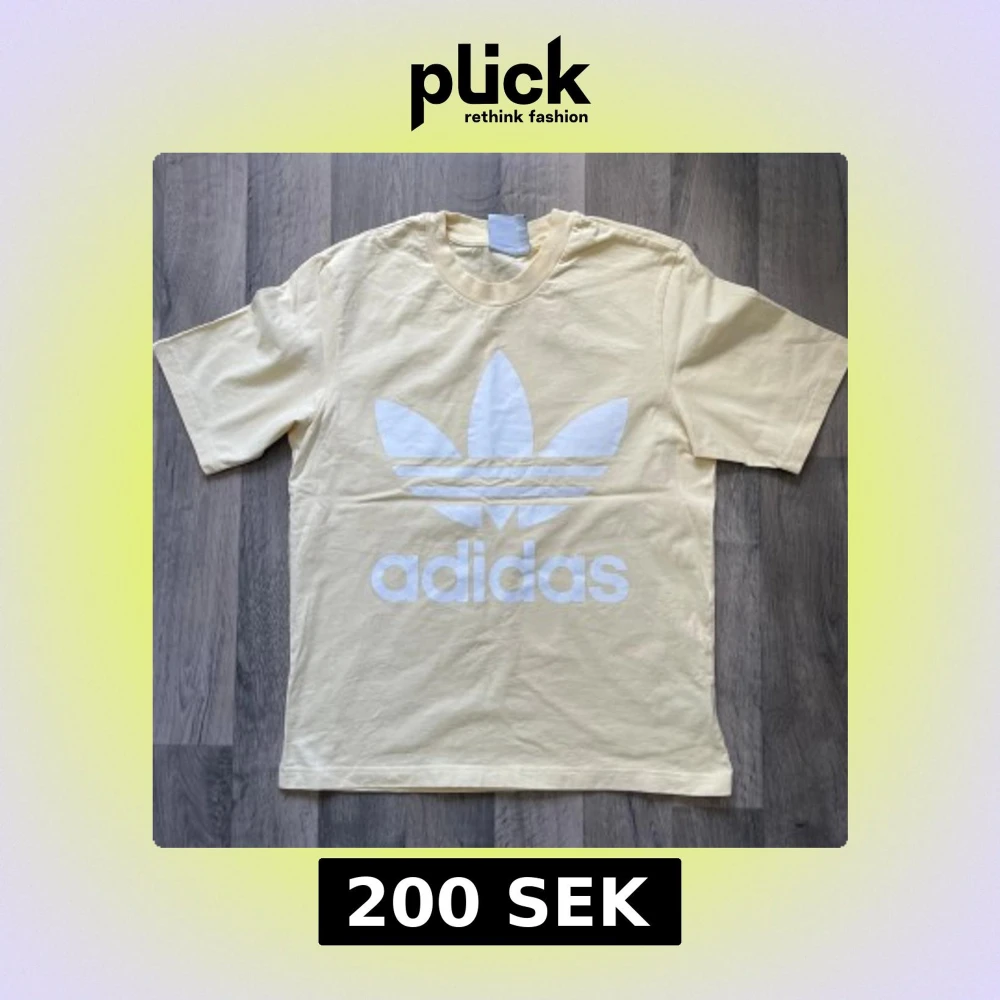 Fräsch ljusgul t-shirt från Adidas i storlek M. Den är i oversized passform. Har bara haft på mig en till två gånger. Modellen är 167 cm lång, väger 63 kg. Längden 73 cm, axeln 48 cm