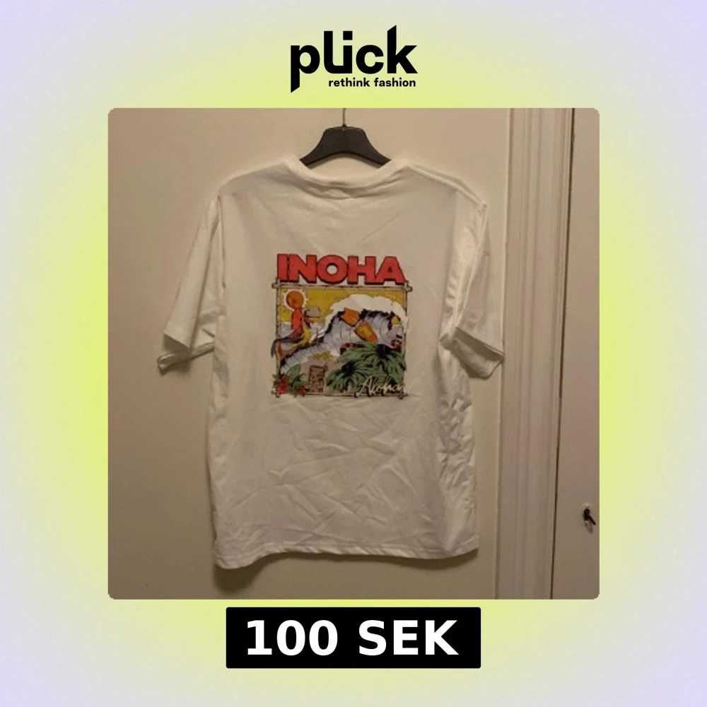 Vit t-shirt med färgglatt tryck på både bröstet och ryggen. Den är helt ny och jag säljer den för att kvaliten är kass. Själva tröjan är helt okej. Lite baggy för mig men känns bra. Den är tillverkad i bomull och är ganska tunn. Men den är en perfekt sommar tröja. Om du ej har lyssnat på INOHA borde du ta å göra det!