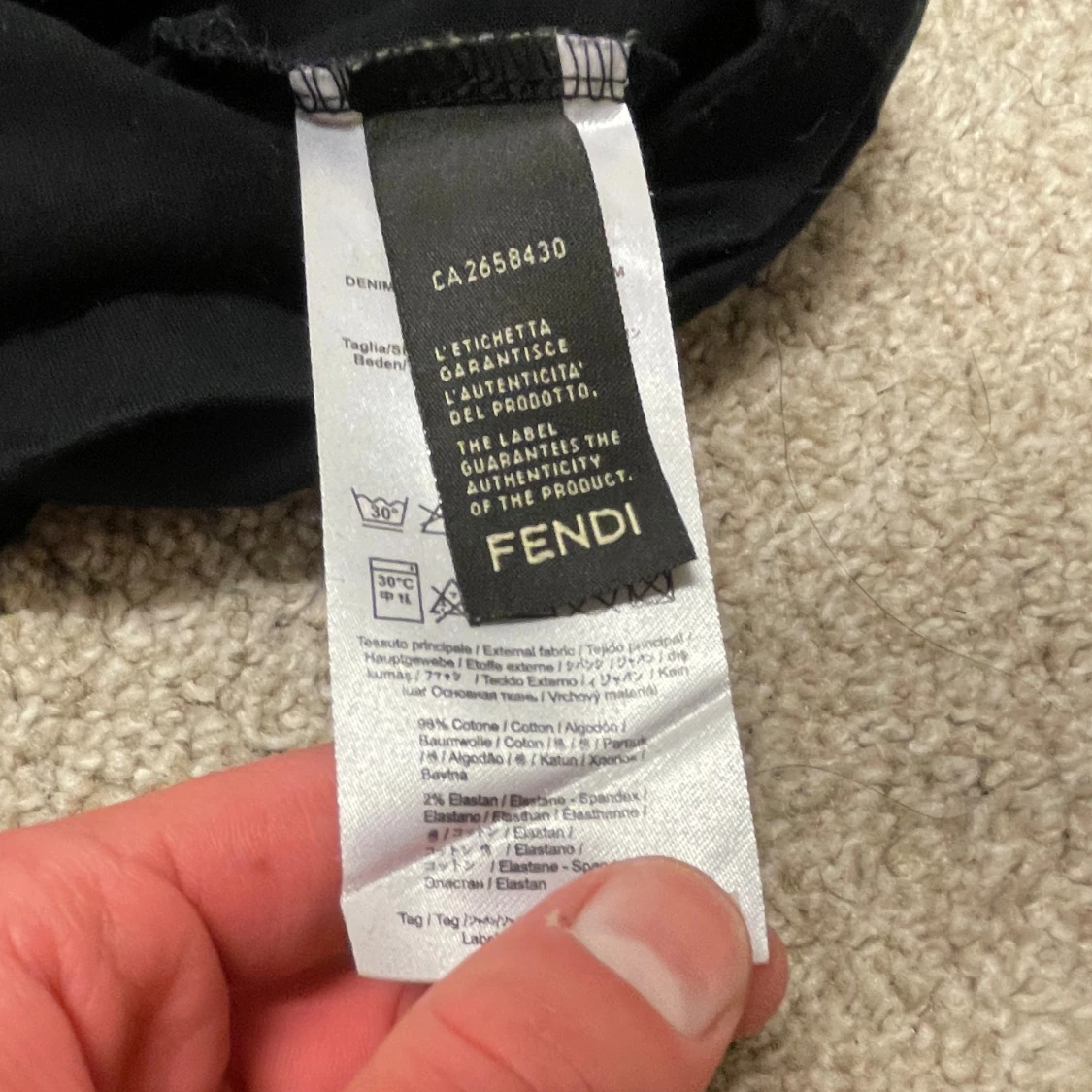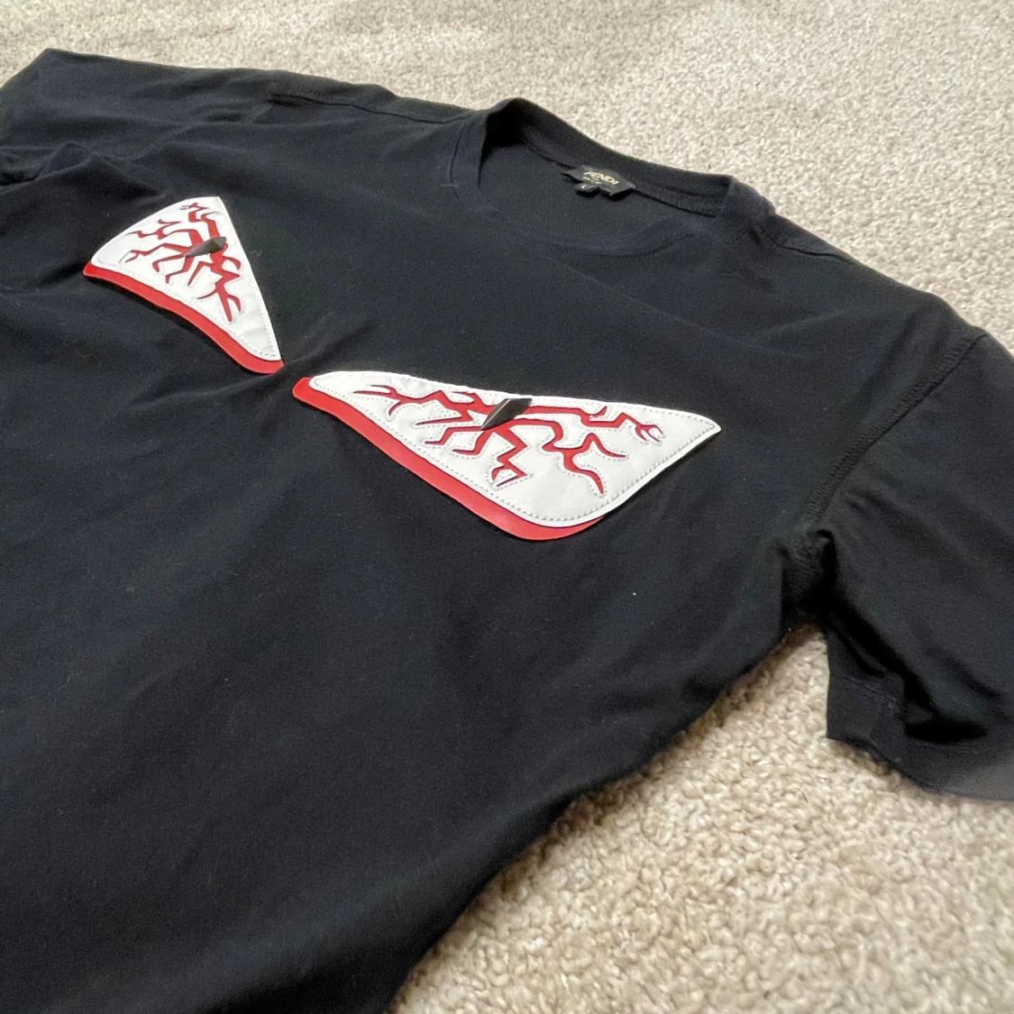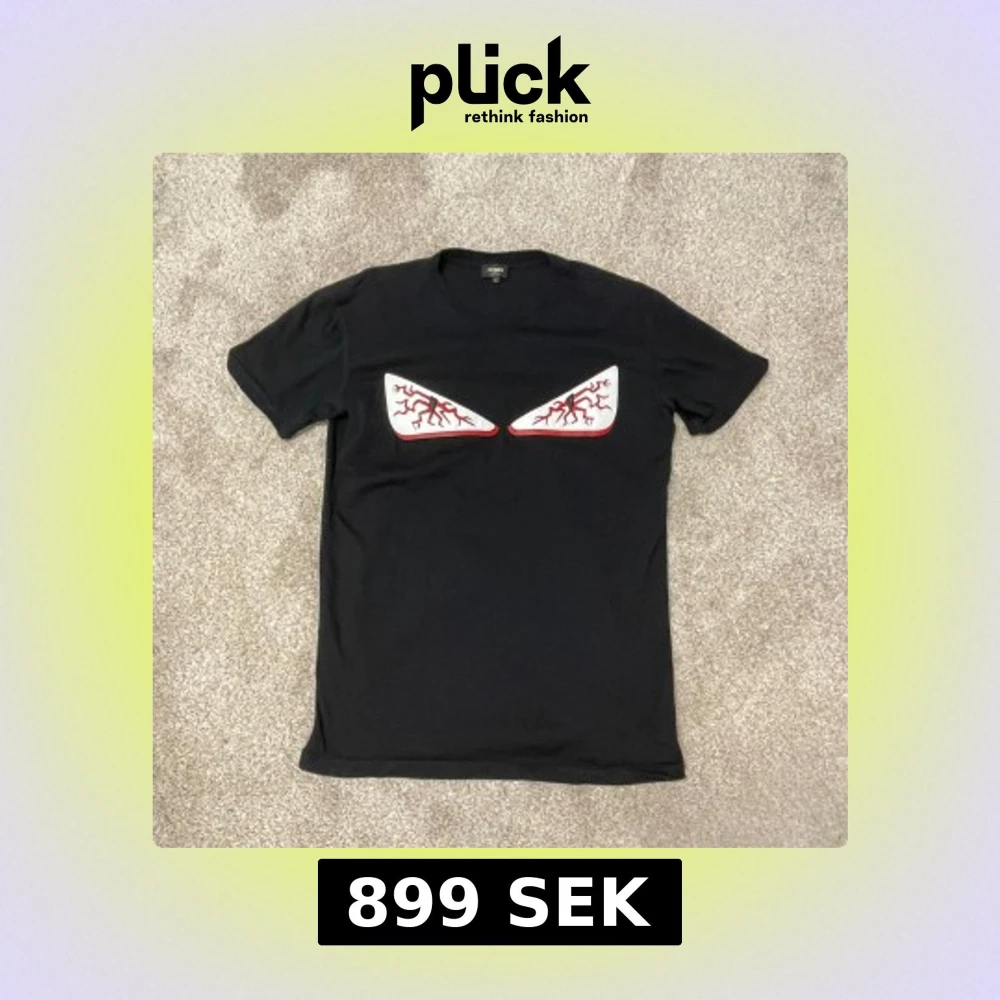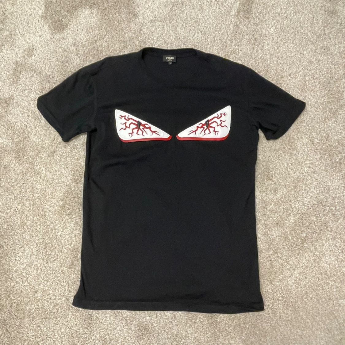 Svart t-shirt från Fendi med korta ärmar och ett unikt ögonmotiv framtill i vitt och rött. Tillverkad i mjuk bomull med lite elastan för extra komfort. T-shirten är i väldigt bra skick. Storleken är L men passar M bra (pris kan diskuteras).