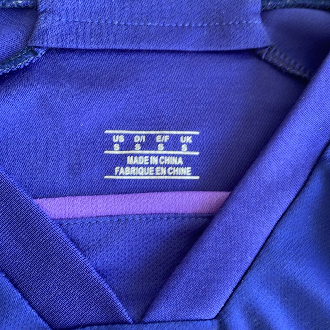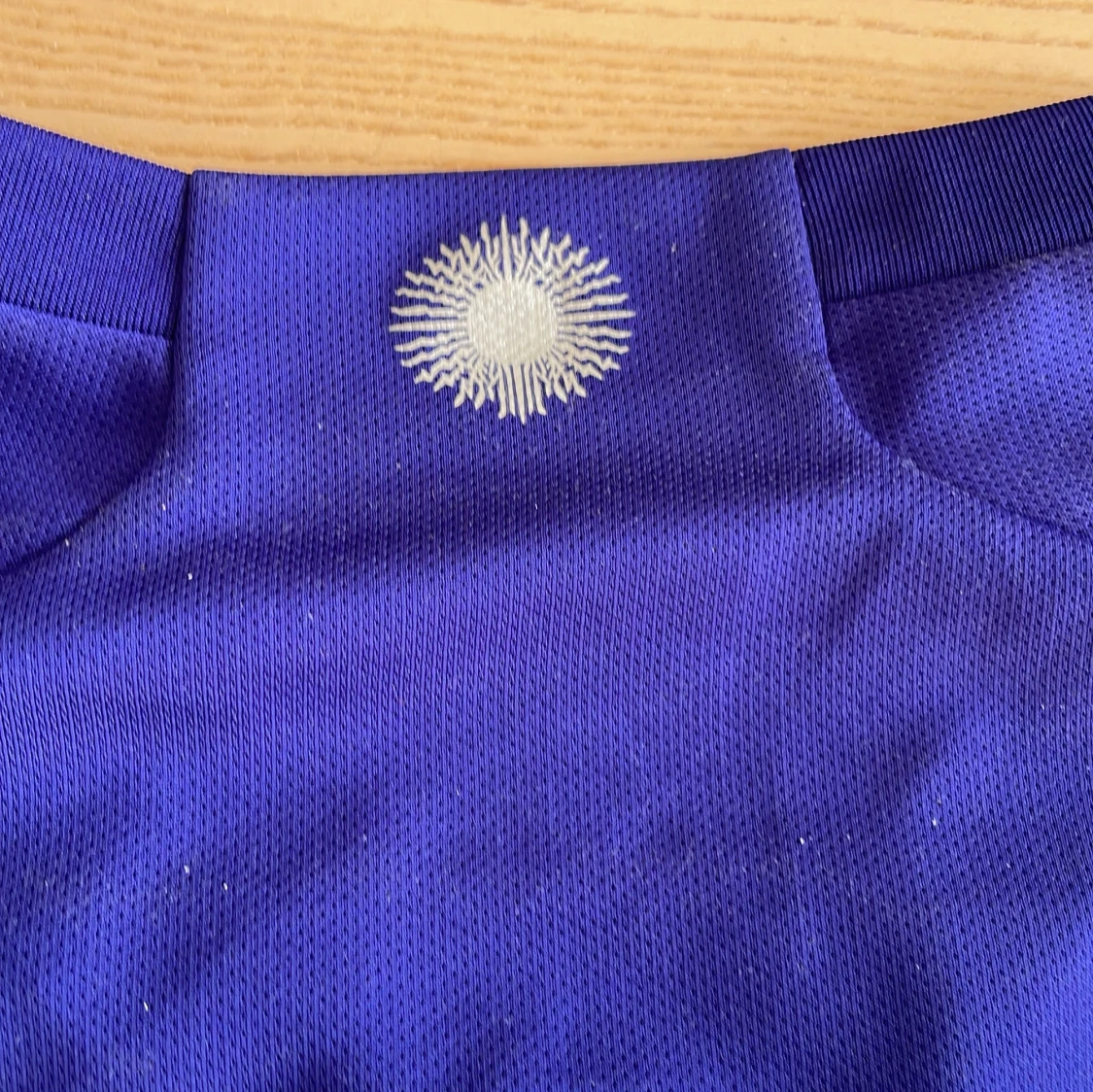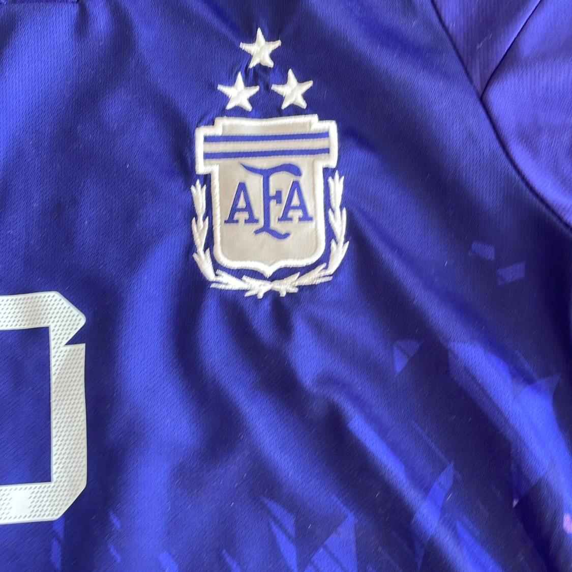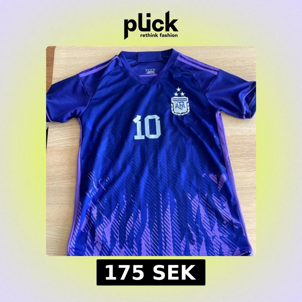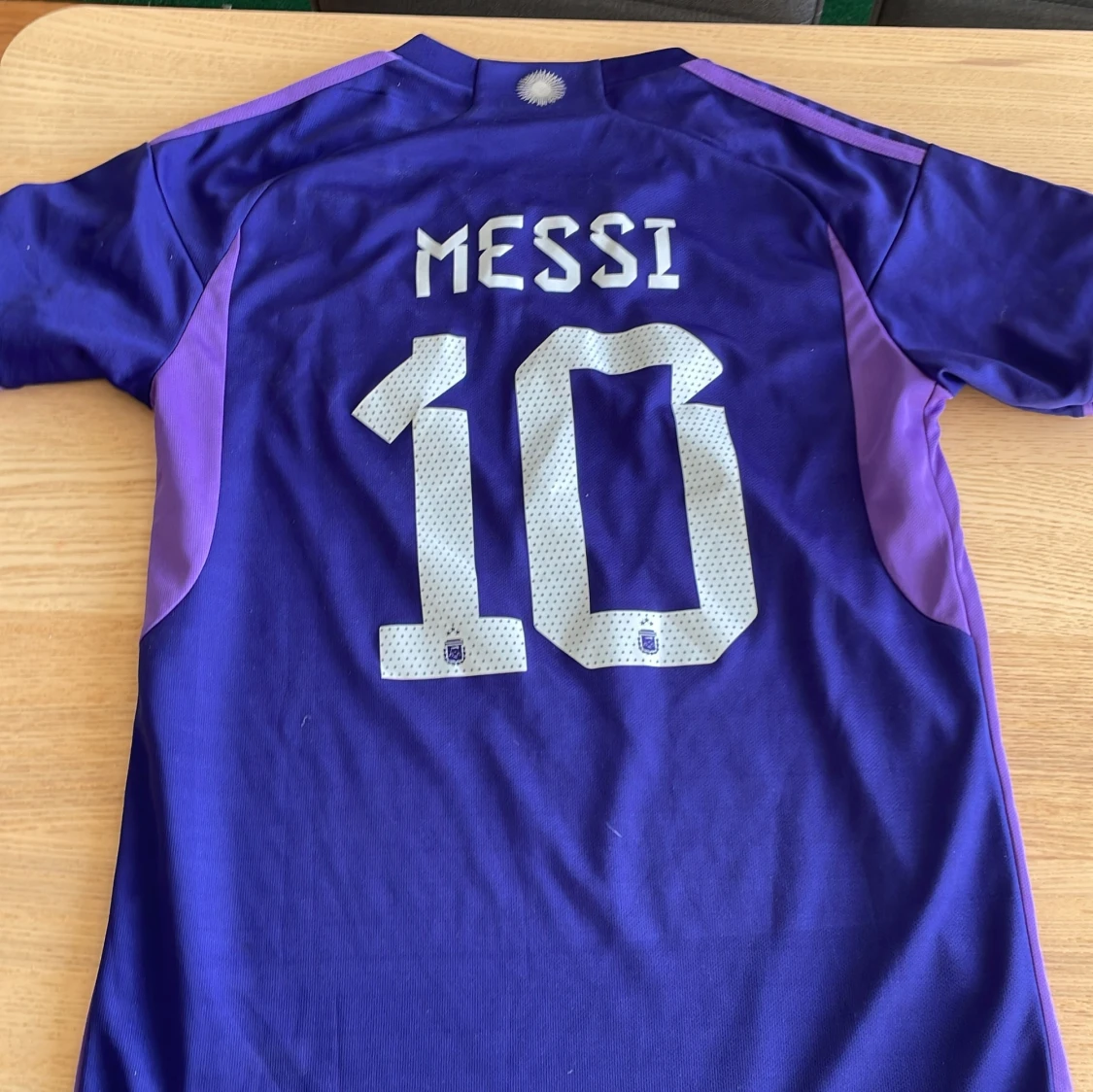 Säljer en lila Argentina fotbollströja med nummer 10 och Messi på ryggen. Tröjan har korta ärmar, AFA-emblem på bröstet och ett mönster i olika nyanser av lila och blått. Perfekt för fotbollsfans!