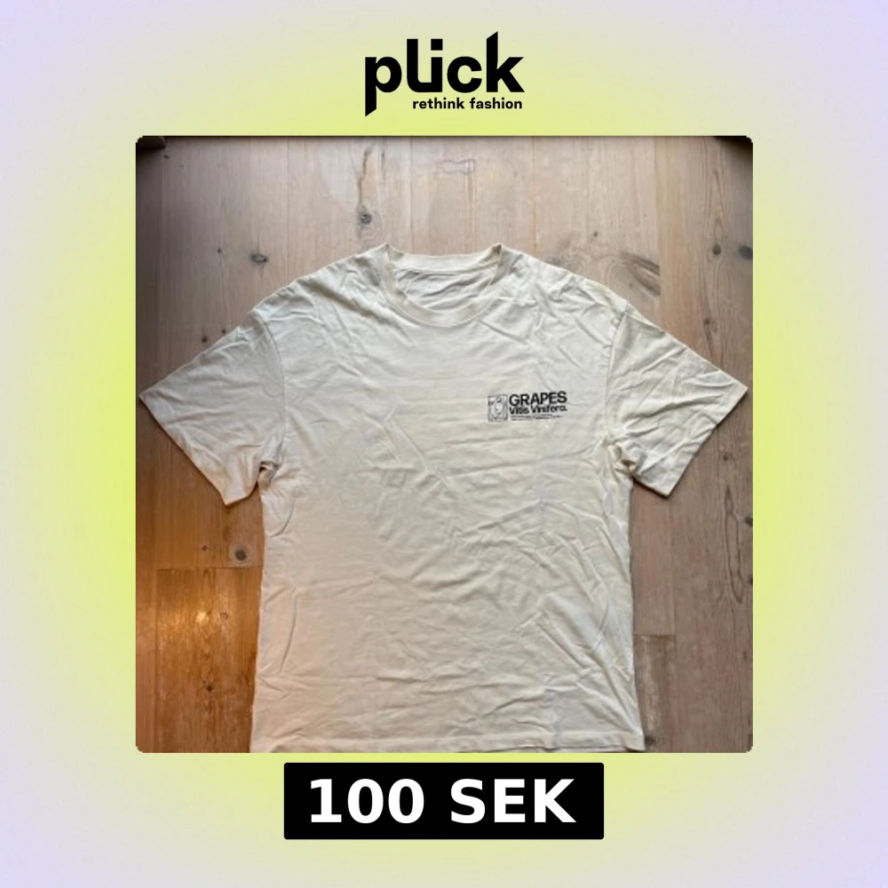 Snygg vit beige från The Gallery (Jack & Jones) med coolt tryck fram och bak. Framsidan har svart text och grafisk tryck, baksidan har färgglada druvor i gult och rött samt stor text. Skön passform och tillverkad i bomull. Skriv vid intresse!