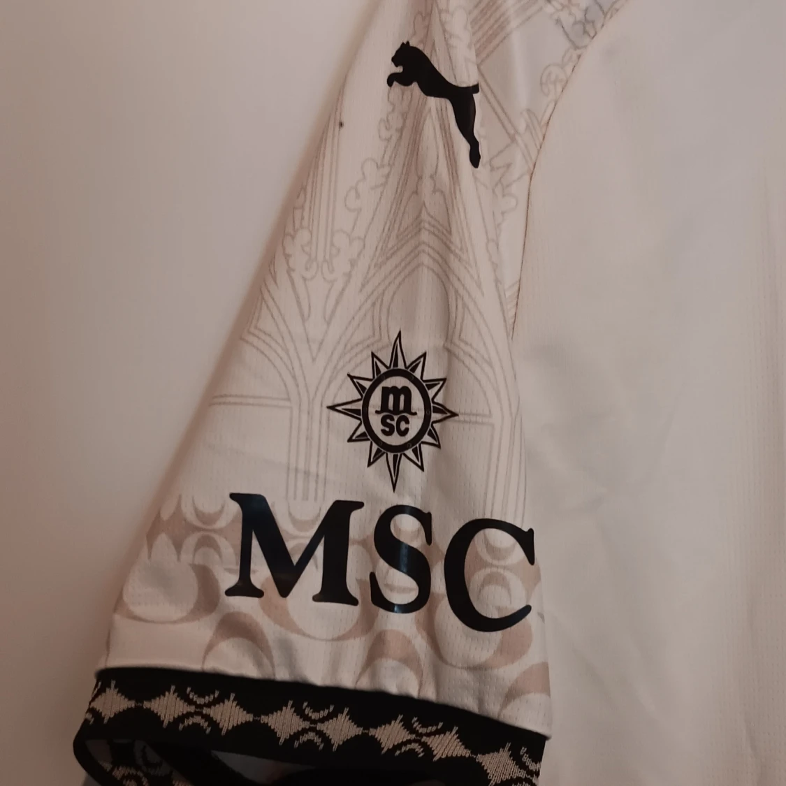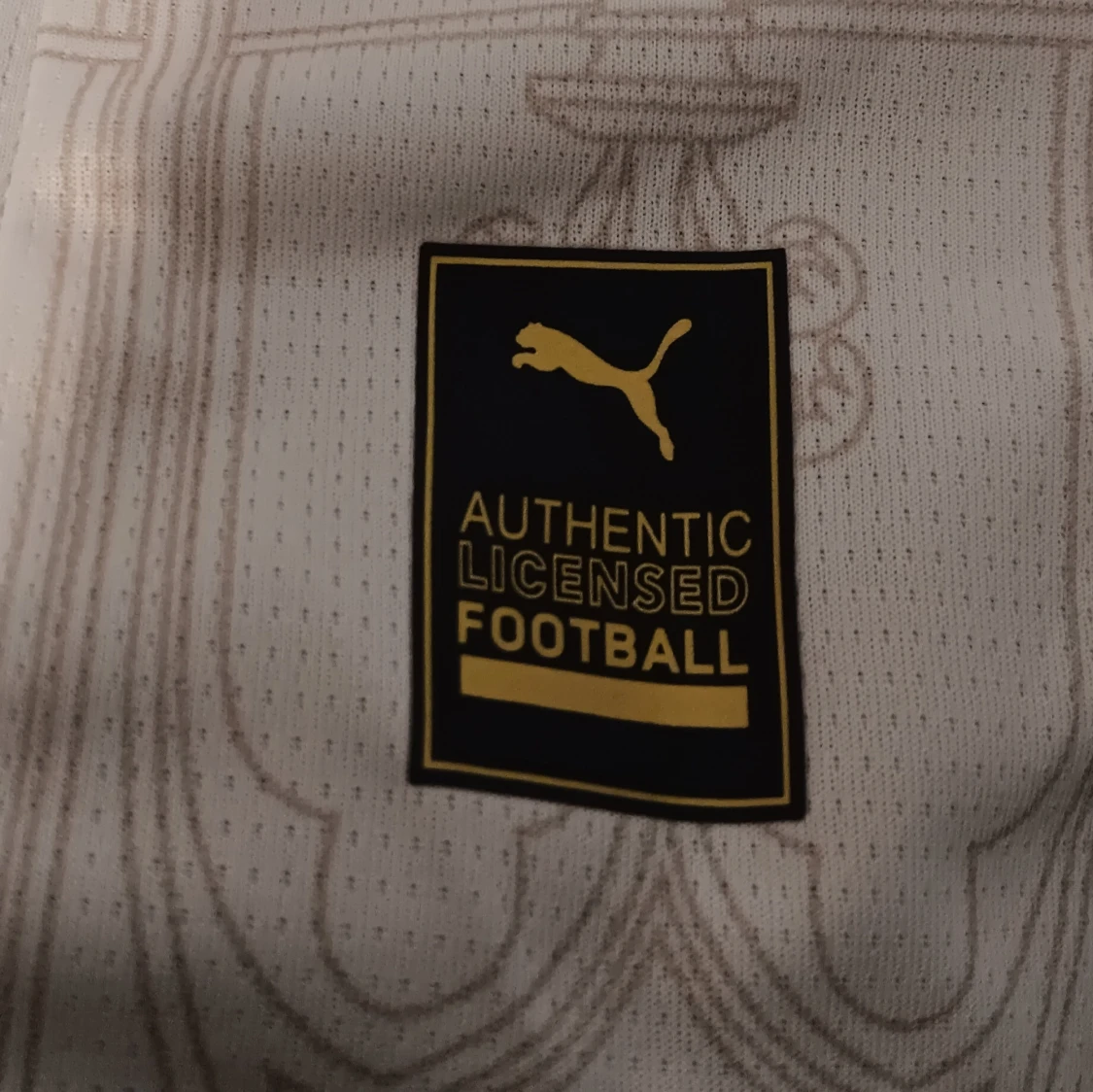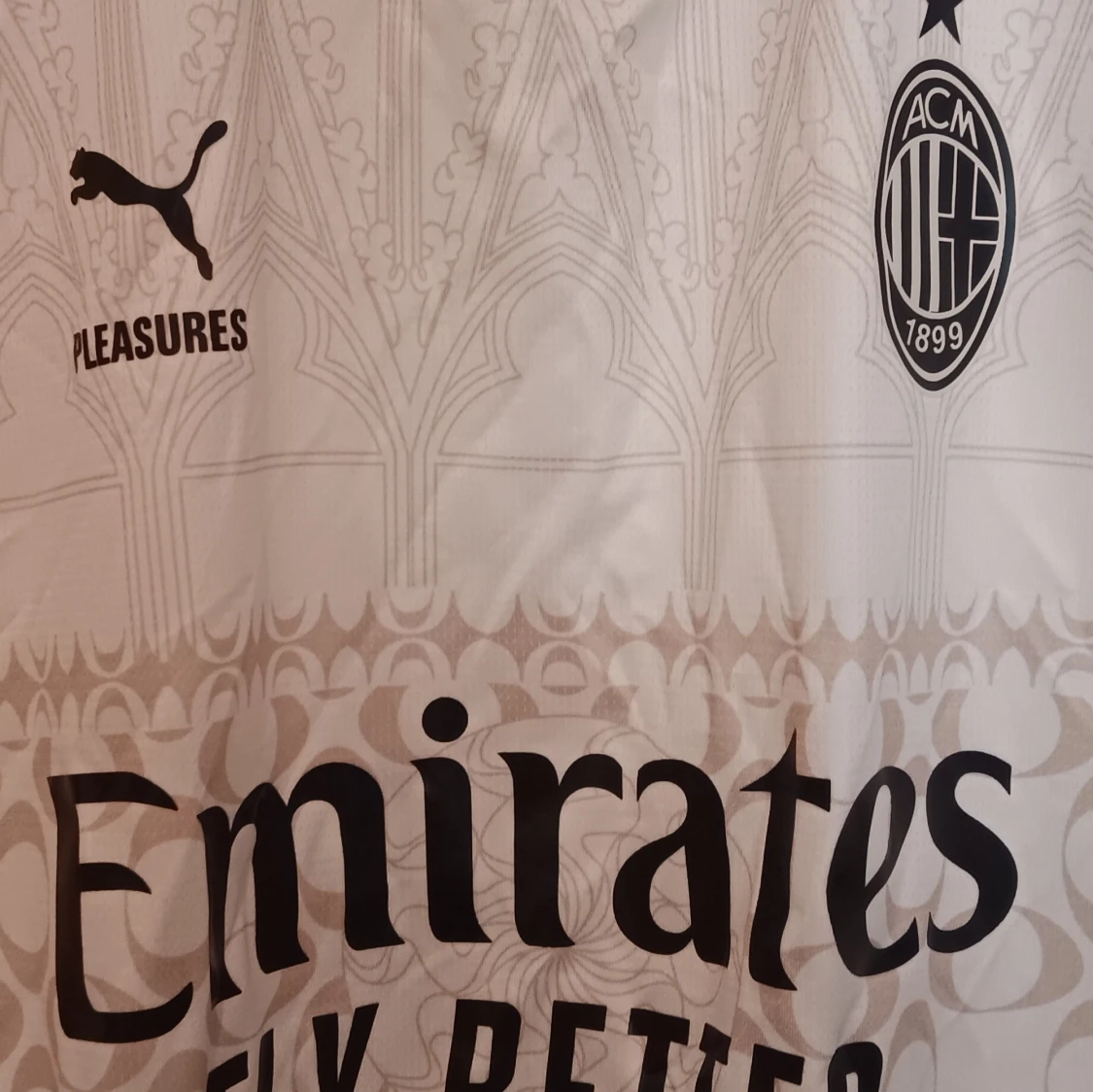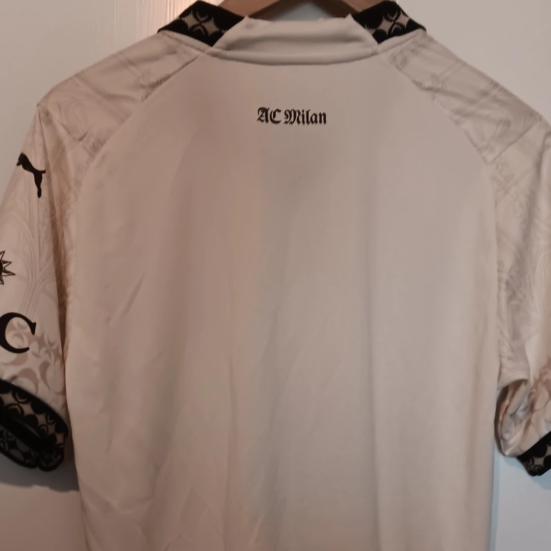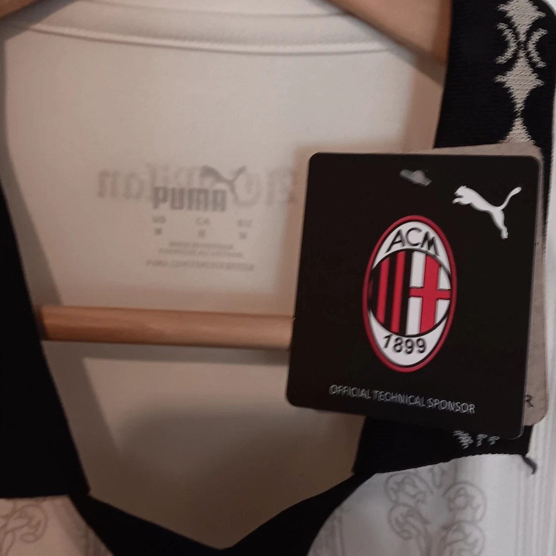 AC Milan fotbollströja i vitt med snygga grafiska detaljer inspirerade av gotisk arkitektur. Puma-logga, klubbmärke och flera sponsorer tryckta i svart. Svartmönstrade muddar och lätt, ventilerande material. Perfekt för dig som älskar italiensk fotboll. Perfekt för sommar.