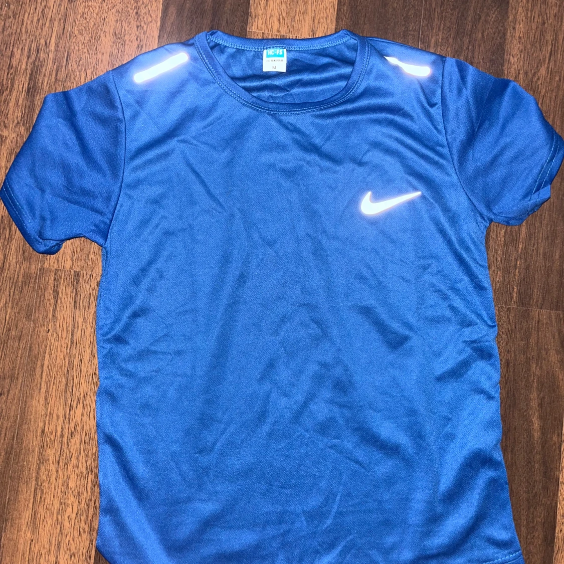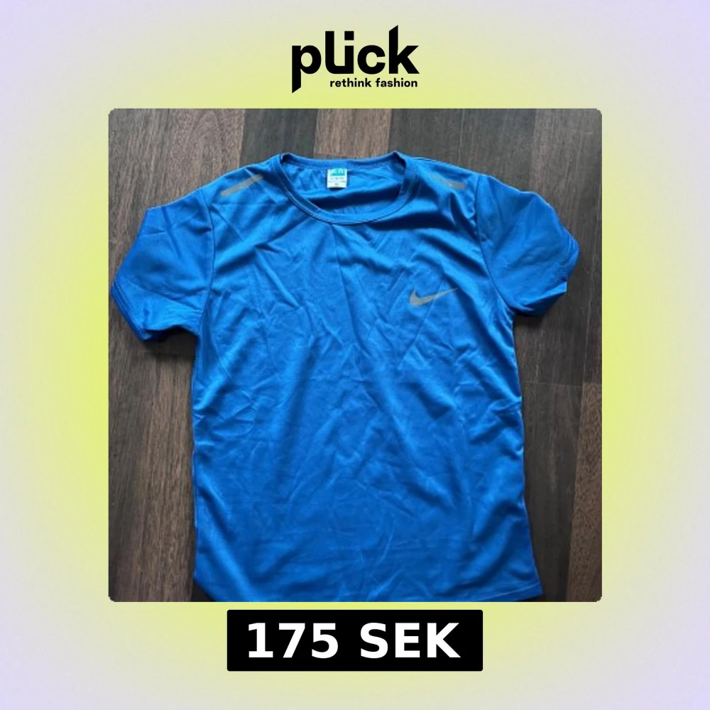 Snygg blå t-shirt från Nike med klassisk logga på bröstet och reflekterande detaljer på axlarna. Tillverkad i ett lätt och ventilerande funktionsmaterial som passar perfekt för träning. Kortärmad och med rund halsringning för en sportig look. Står M på tröjan men skulle snarare säga att det är tight S / loose XS