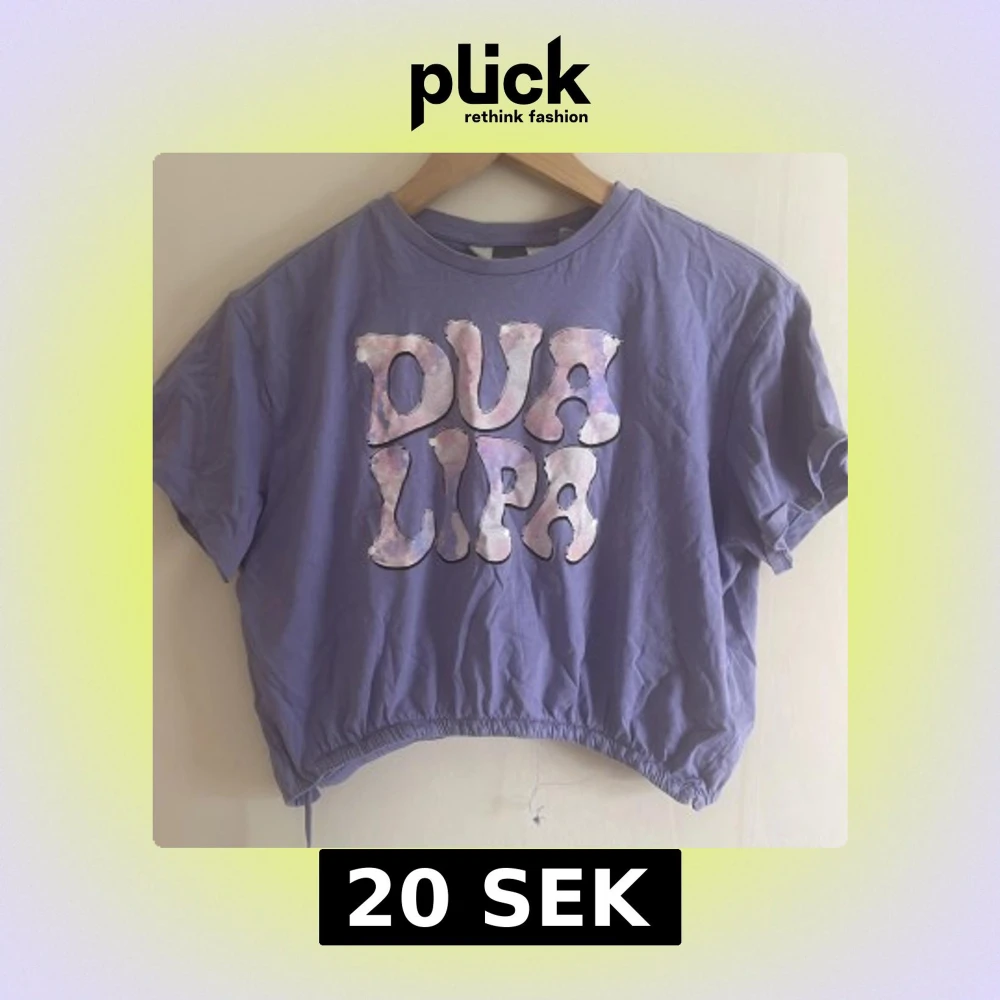 Säljer en lila t-shirt från H&M med stort Dua Lipa-tryck i pastellfärger på bröstet. Modellen är croppad med dragsko nertill och har korta ärmar. Perfekt för dig som vill ha en cool och avslappnad vibe.