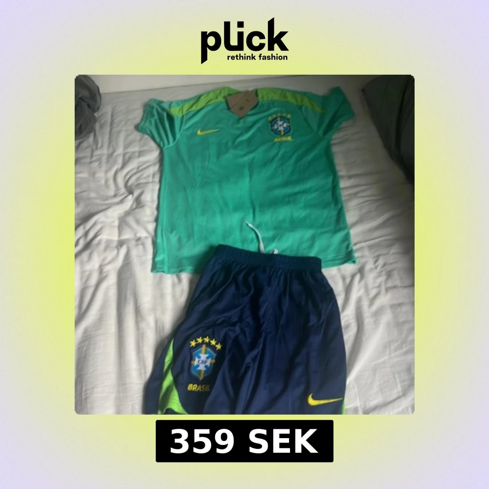 Säljer ett Brasilien fotbollskit med kortärmad grön tröja och blå shorts. Tröjan har gula detaljer och Brasilien-emblem på bröstet. Shortsen är blå med gula och gröna inslag samt Brasilien-logga och Nike-märke. Perfekt för sommarn
