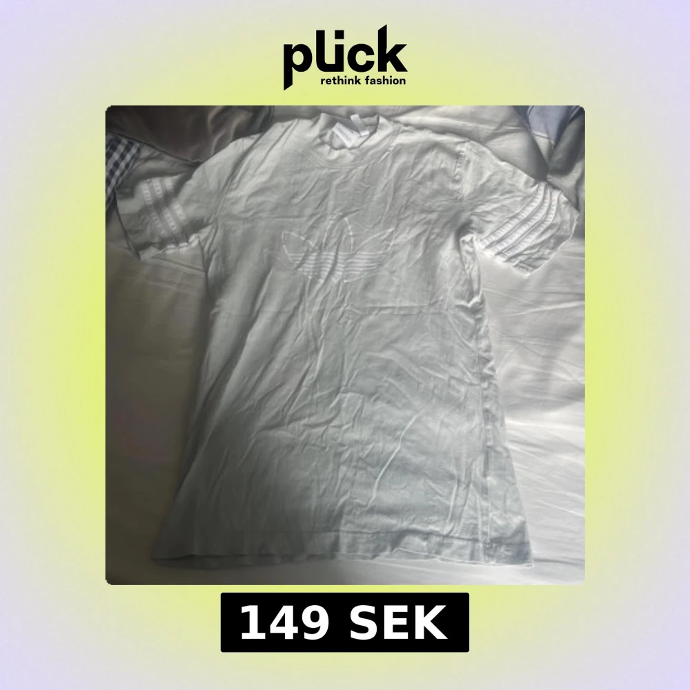 Säljer en vit t-shirt från Adidas med det klassiska trefoil-loggan ton-i-ton på bröstet och tre ränder på ärmarna. T-shirten är i mjuk bomull och har en avslappnad passform. Perfekt för dig som gillar sportig och clean stil.