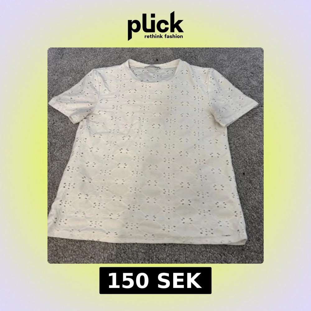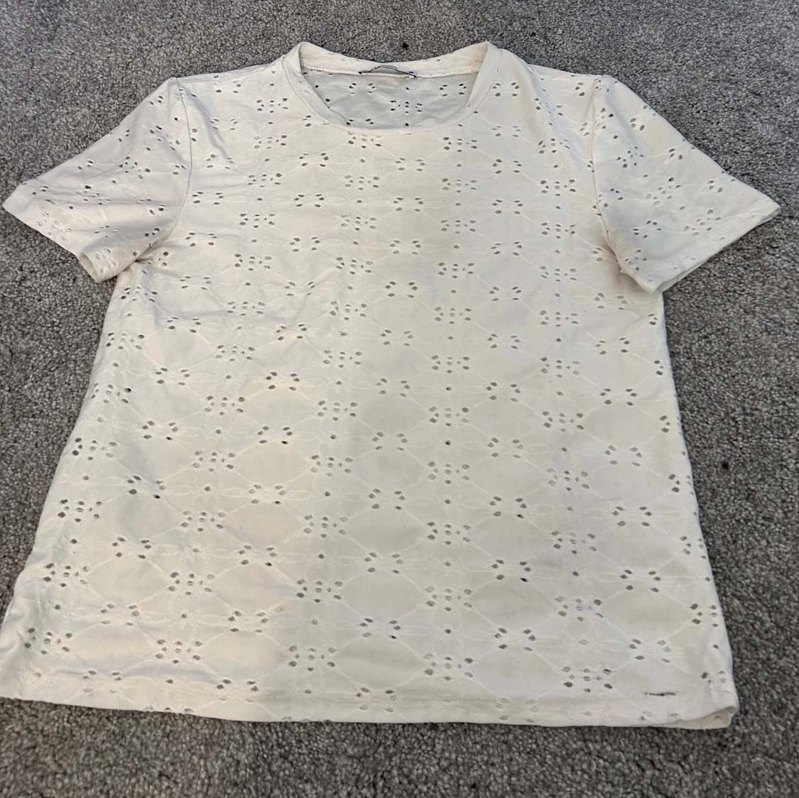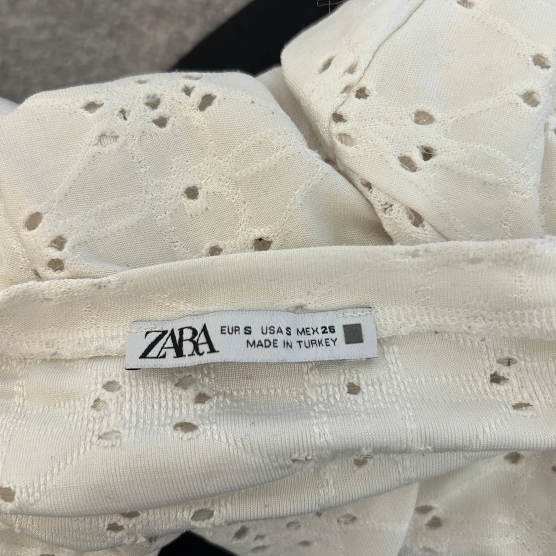 Säljer en vit T-shirt från Zara i storlek S. Med fina detaljer på💗har ett litet hål längst ner som var där när ja köpte den i butik🤗