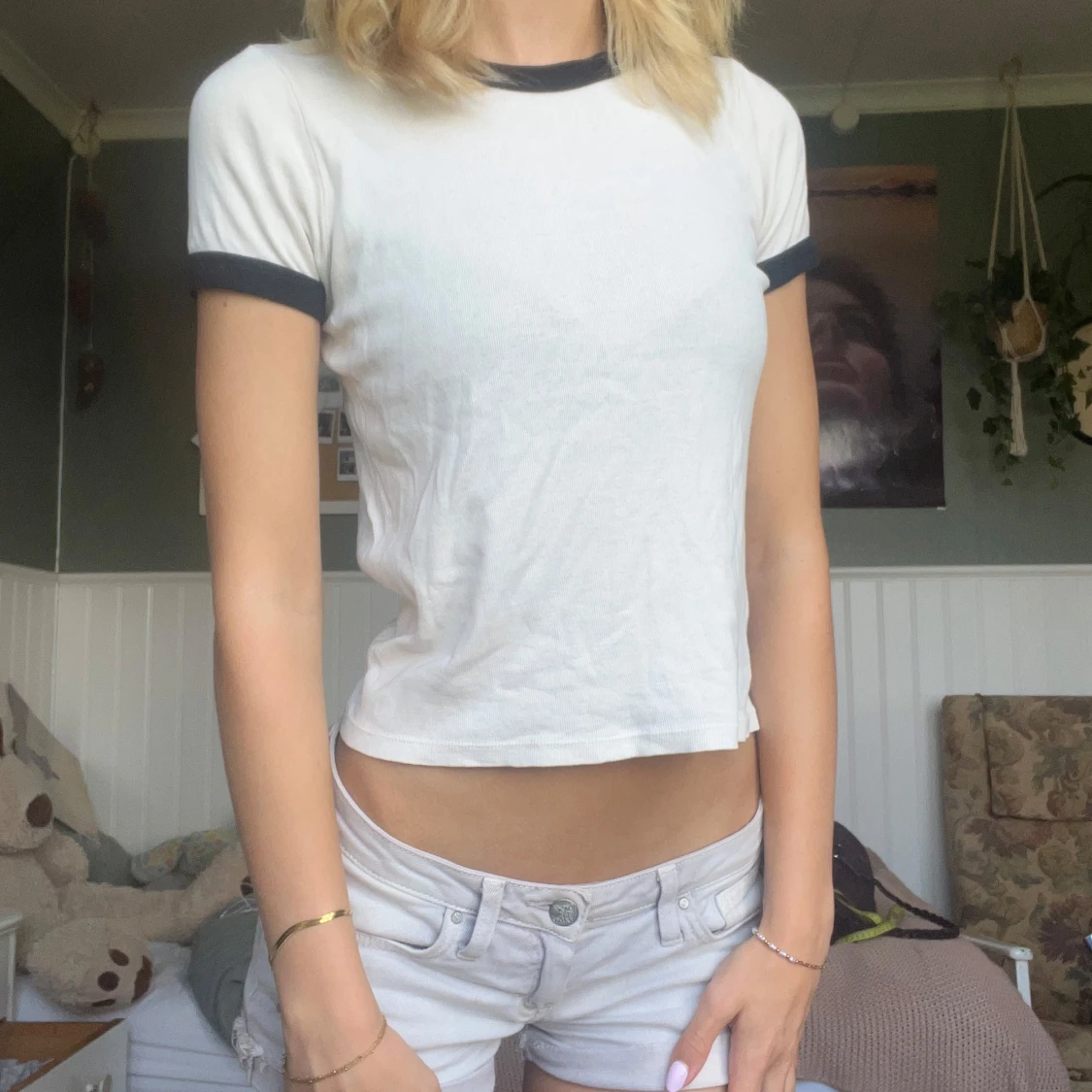 Säljer en vit t-shirt med svarta muddar vid ärmslut och halsringning. T-shirten har korta ärmar och är i mjuk bomull, perfekt för en chill och stilren look. Enkel och klassisk design som passar till det mesta.